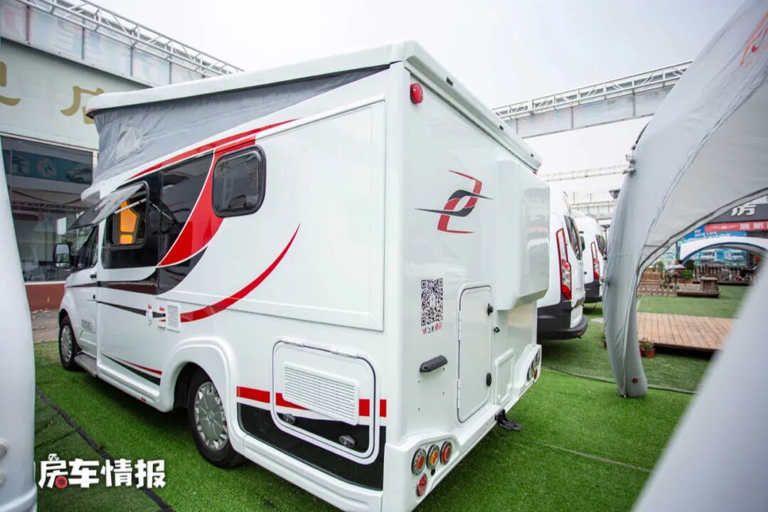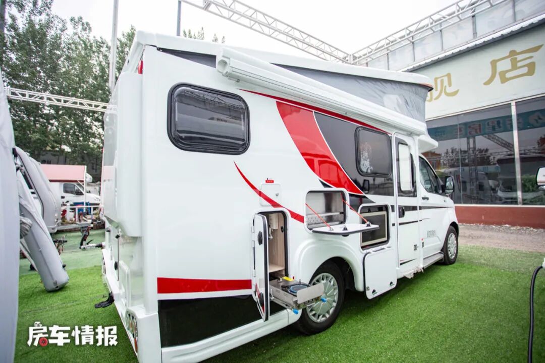 这款房车是基于福特全顺商务车底盘改造的,全车以白色为基调,搭配红黑撞色色条,运动感十足。全车不升顶时的尺寸是5995*2240*2290(mm),轴距为3300mm,高度和一般的B型房车高度相似,所以上路行驶完全不用担心限高的问题。整车长度不到六米,满足蓝牌C本驾驶。