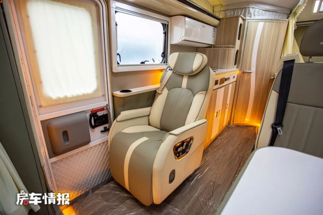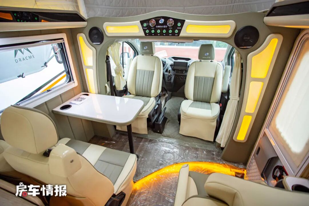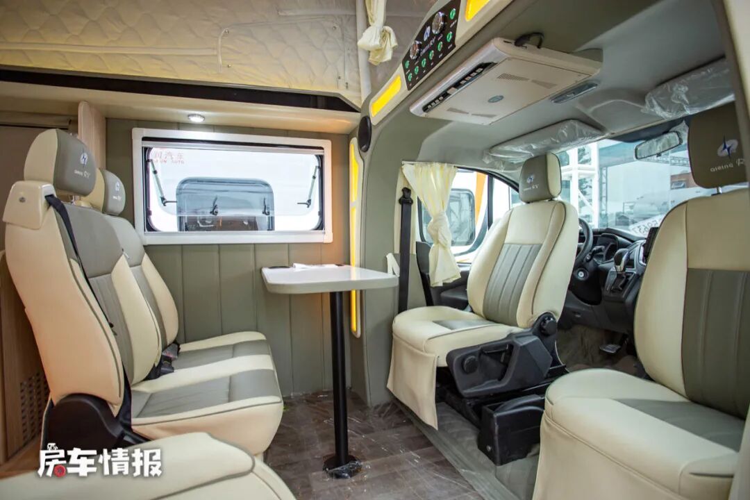 正对乘客门的是会客区,提供了一排皮质软包的沙发座椅,上面配有两条安全带,平时行驶途中可以坐人,前面的餐桌尺寸虽然不大但是上面带有两个杯槽,还是很方便的。前方驾驶室的主副驾驶座椅均可向后旋转,顶部还隐藏了一台19寸的可折叠电视,平时可以观看电视节目。