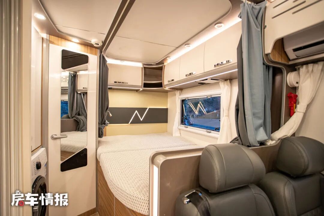 尾床则是采用了私密性更强的尺寸为2250*1400mm的横置双人床铺,并提供了大量的储物柜用来存放换洗衣物和被褥,床板下方还配置了一台小型的洗衣机。