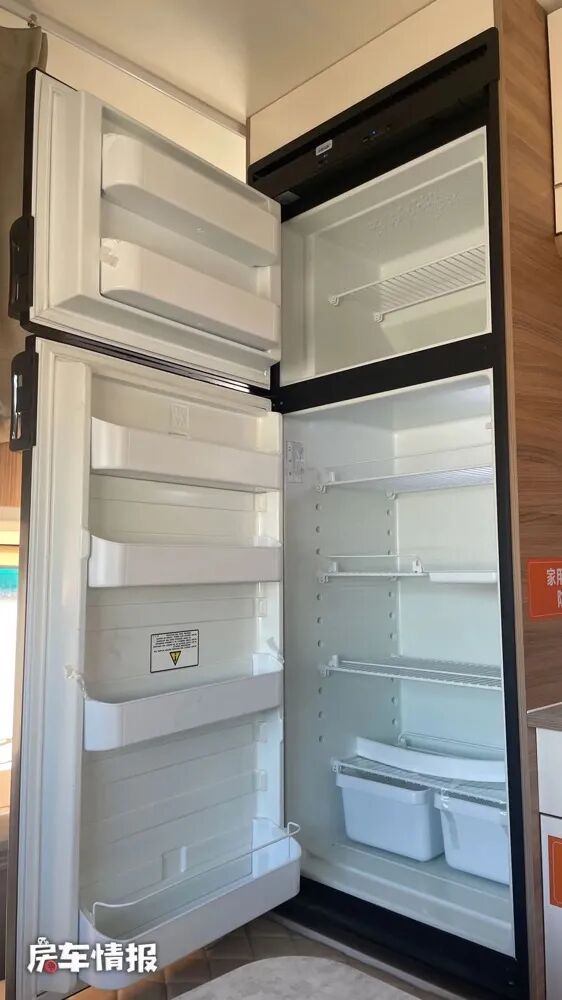 这款新星最新推出的旅行官700P房车,最大的一个亮点就在于内部的厨房,可以变成一个全封闭的区域,因为全车采用了一个中部上门的设计,所以副驾驶后方到乘客门处均为厨房区,最前方是一台152L上下双开门的冰箱,后方的厨房操作台则集合了不锈钢洗菜池、电磁炉、集成式下排式的抽油烟机和微波炉等厨用设备,另外上下方还配备了多个储物柜,足以存放日常的烹饪用具。