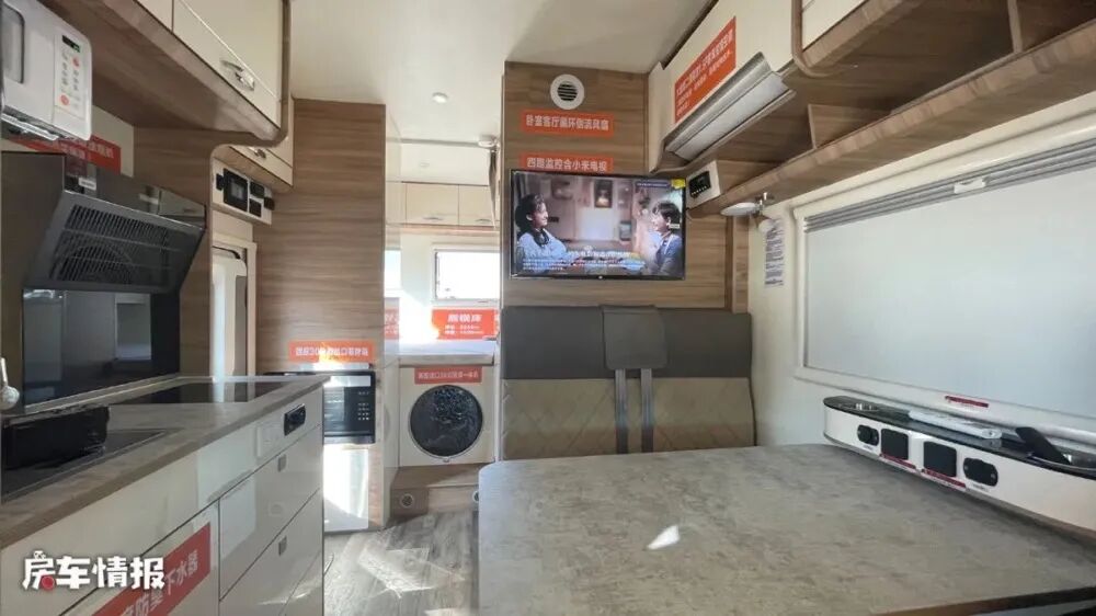 车厢前方为全车的会客区和厨房区,会客区依旧是经典的卡座沙发+升降餐桌的设计,顶部储物吊柜旁边还提供一台家用变频空调,后期也可以在后背处选装一台带有四路监控功能的小米智能电视,提升整车的安全性,还能满足日常的娱乐需求。