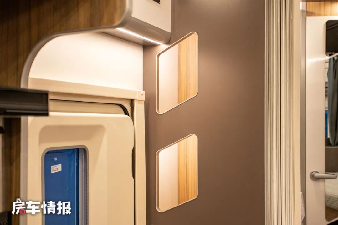 因为横置床的设计,所以全车的卫浴室是位于乘客门的正对面,内部的空间也很宽敞,配置也比较齐全,日常的洗澡洗漱都是没有问题的。