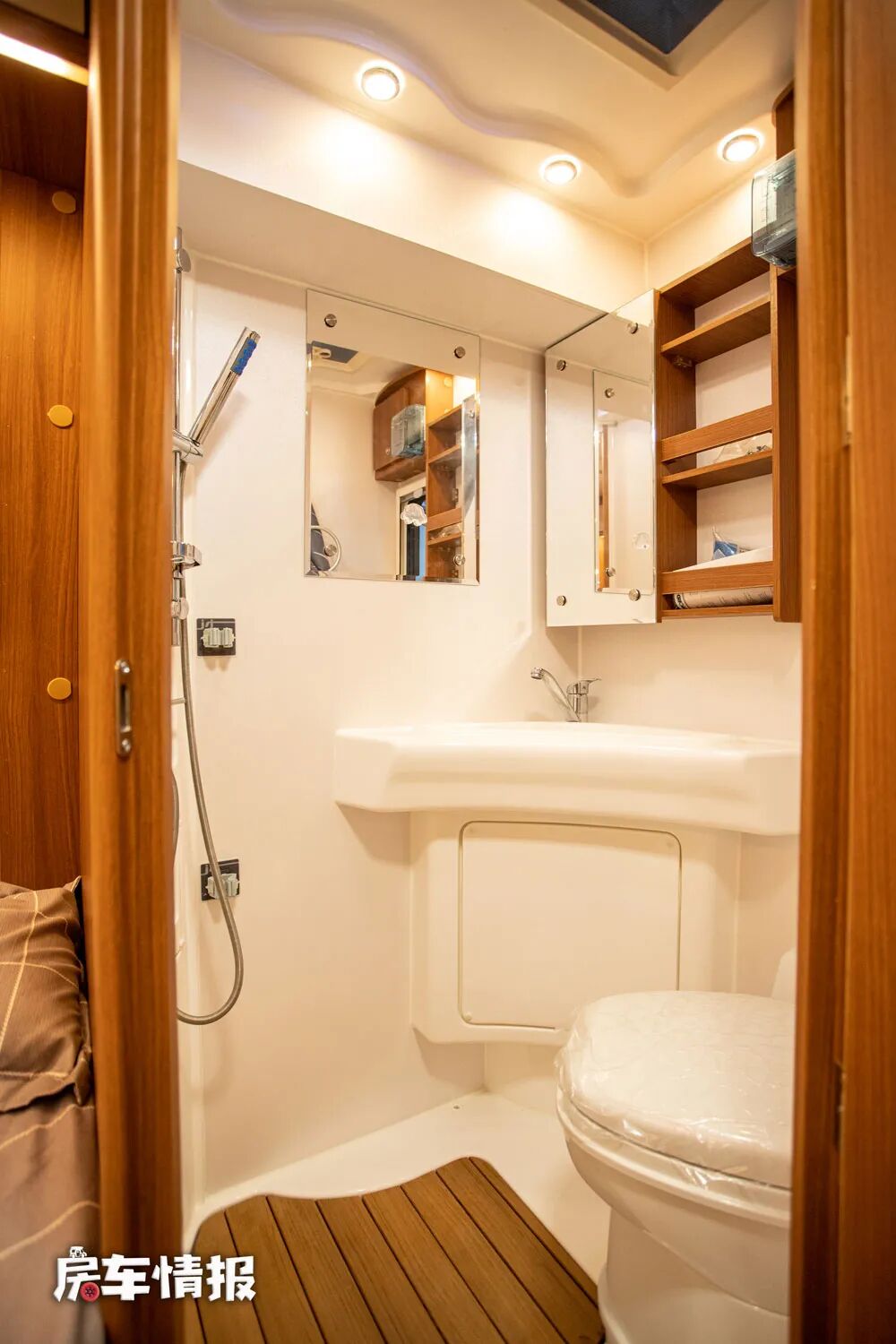 尾床旁边则是全车的独立卫浴室,在同类房车中这个卫浴室的空间表现还是非常不错的,另外也提供了丰富的设施,以保证日常的洗漱需求。