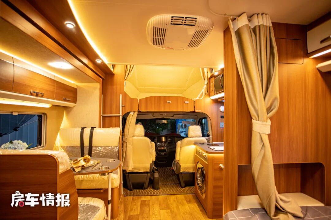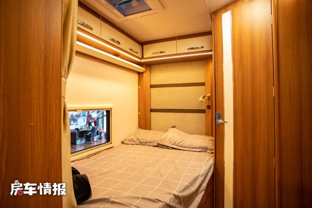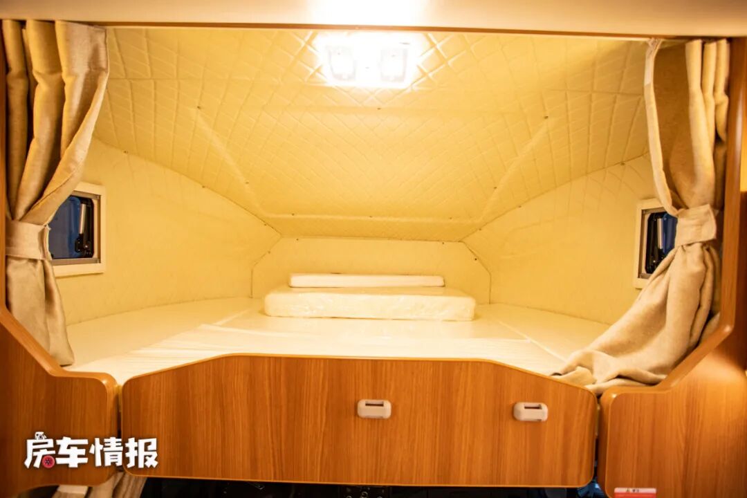 进入到车内给人最大的感触是空间很大,做工也比较精致,尤其是家族式的内饰风格带来了豪华的感觉。而在空间表现上,不仅得益于侧面的拓展舱,更是因为尾床与众不同的位置,而使整体的空间感也有所上升,这也是我们刚才所说的,“镜像”式的设计也给人带来了耳目一新的感觉,尾床的尺寸为1850*1150,可以容纳身材娇小的两个人,顶部配备了换气扇以及储物吊柜,方便存放日常换洗的衣物。