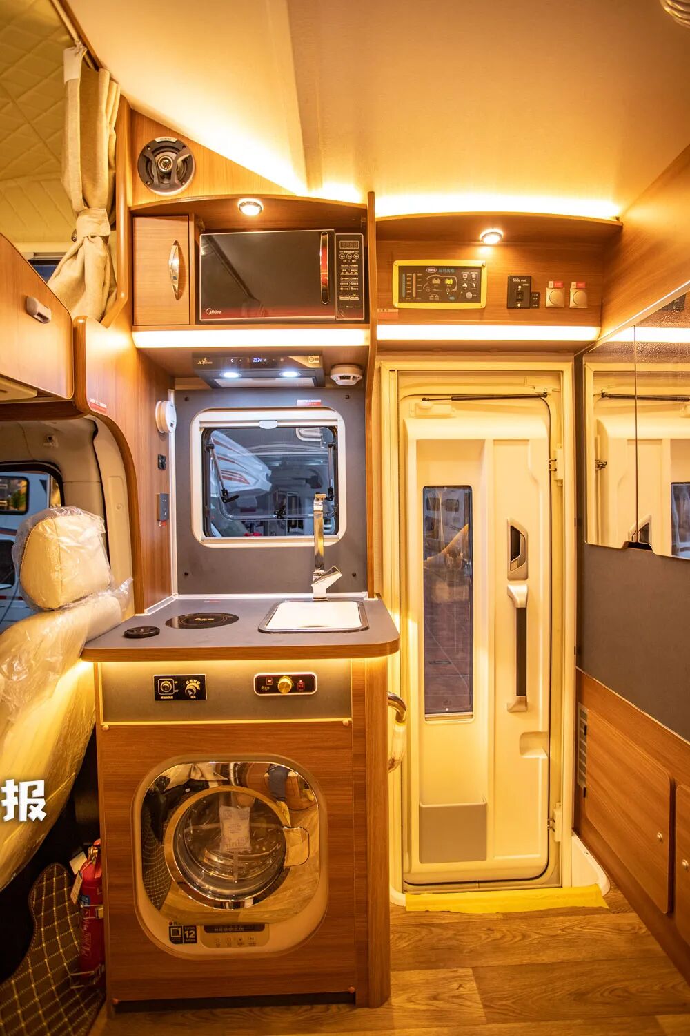 因为采用了中部上门的设计,所以整车的厨房区被放置在了乘客门的前方,尺寸虽然不太理想,但是却配置了丰富的设施,包括电磁炉、水槽、抽油烟机、微波炉和洗衣机。