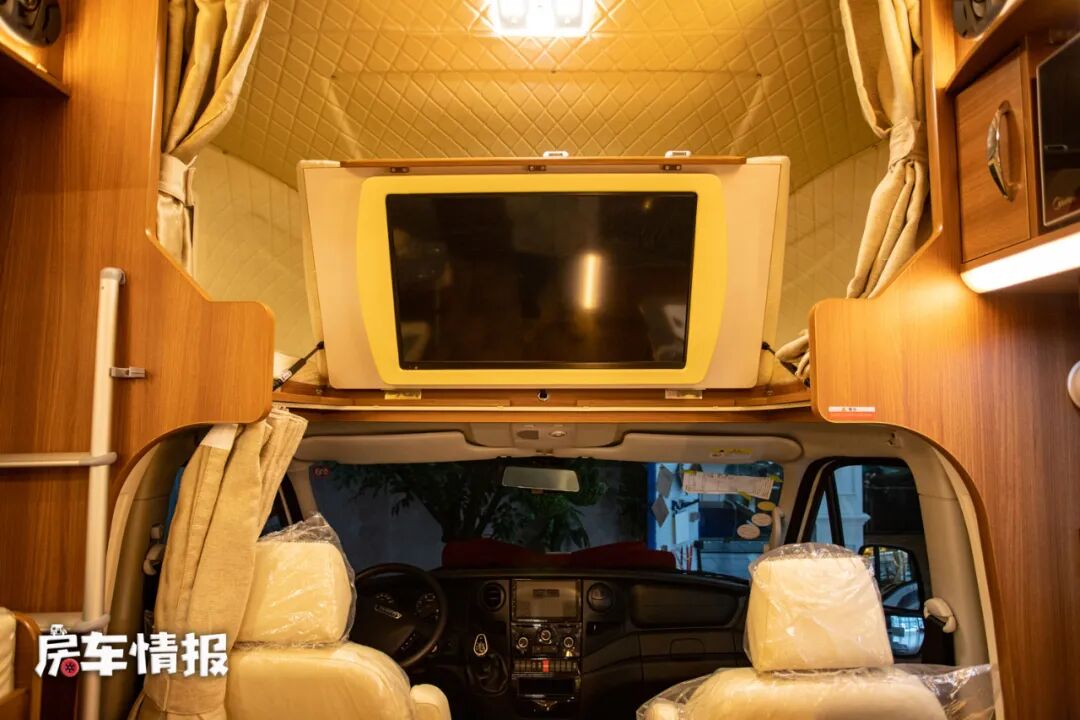 另外就是常规的额头床,尺寸达到了2200*1500mm,床板下方还提供了一台32寸液晶电视,满足日常的出行娱乐需求。