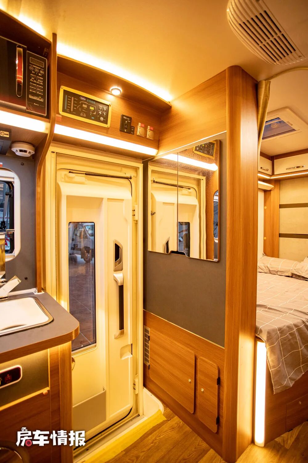 因为“镜像”了尾床,所以在床尾处增加了一组立式储物柜,既可以提升整辆车的储物能力,还可以作为屏风使用,也保证了休息区的私密性。