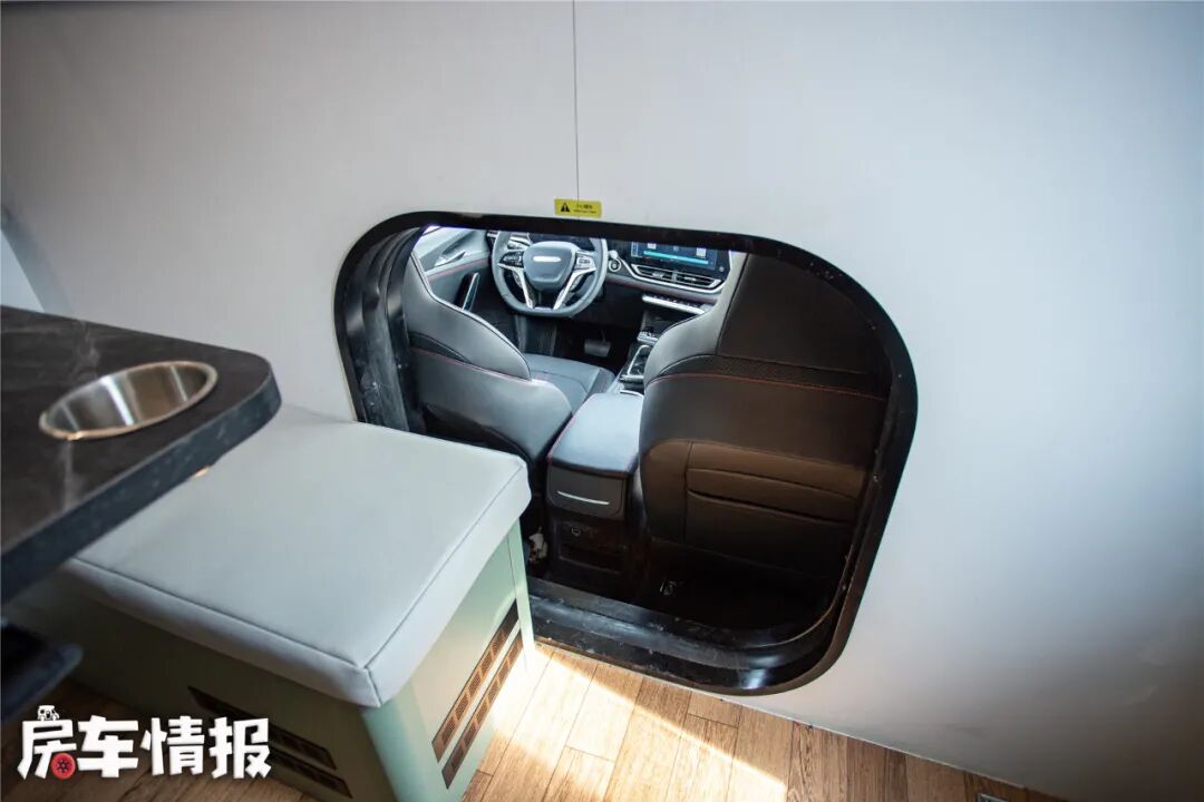 另外大家比较关心的通舱设计的问题上,由于这款车采用的前后软连接,驾驶室和生活区的开口比较小,想要从这里穿行是不可能了,简单交流还是没问题的。