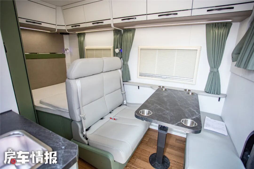 车内整体的设计风格采用了一个云岫绿的配色,给人一种青春活力的感觉,作为一款核载4个人的车型,虽然车内的会客区是采用了四人对卡座沙发+升降餐桌的设计,但是只有面向前方的座椅带有安全带可满足行车时也能乘坐的要求。