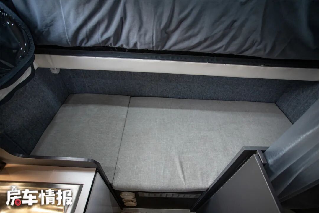 除此以外,位于车尾部还提供了一张横置单人床,尺寸约为0.75米*1.9米,睡下一个成年人没有问题并且位于单人床两侧都带有墙体,行车时可以把床褥等衣物放在上边,不用担心来回滚动。