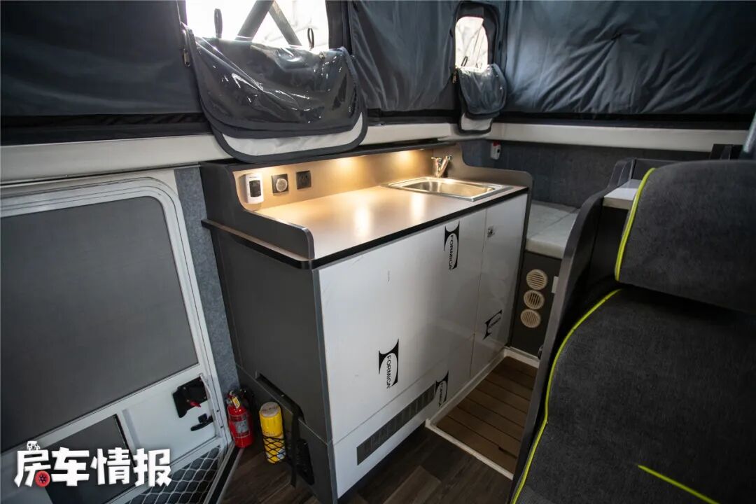 车内厨房的操作台尺寸比较大,内侧提供了一台洗菜池,外侧提供了一台抽拉式的车载冰箱。
