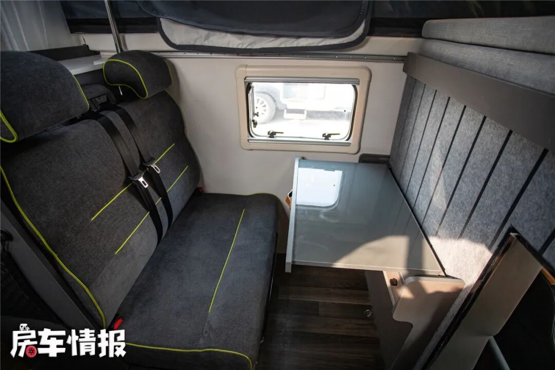 生活区还提供了一组双人座椅,取消了常规的对卡座,搭配驾驶室两个座椅,整车荷载4人,双人休息区提供了一张隐藏餐桌,打开方式有点和飞机经济舱的小桌板类似,只不过这个是隐藏在前方墙体上。