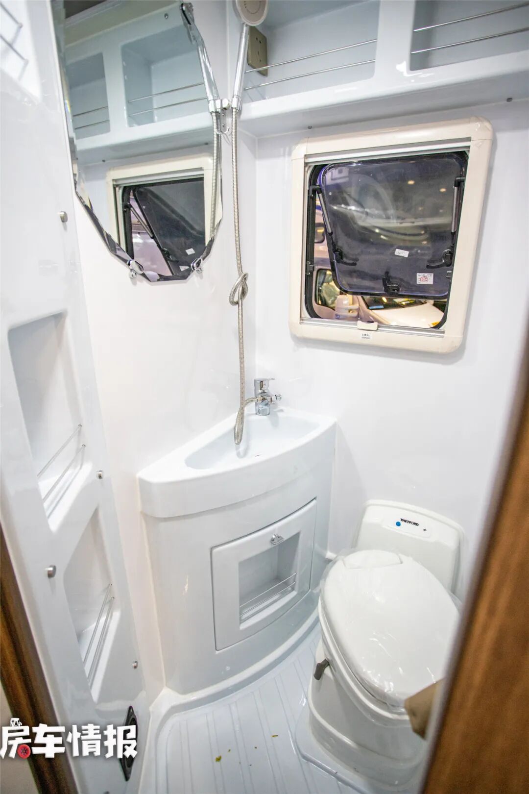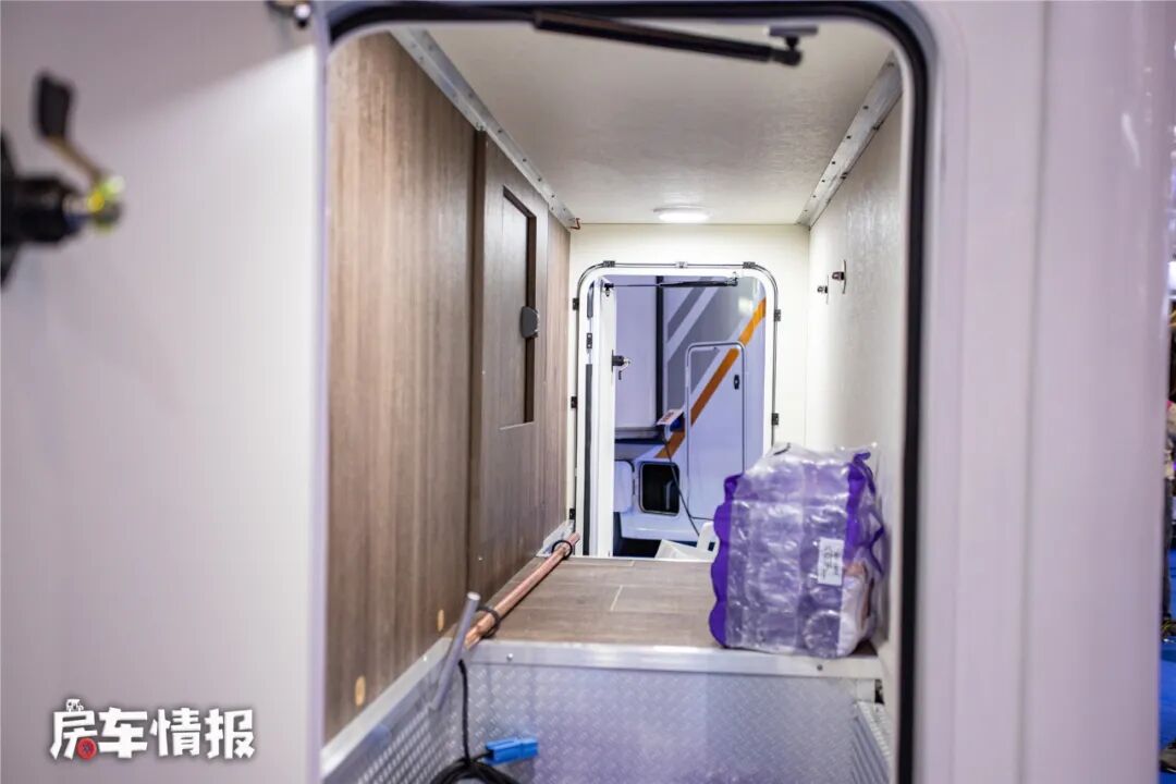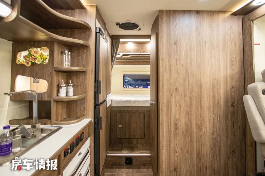 橱柜的尺寸比较大和卫生间共同组成了一个封闭式设计,将车位床“隐藏”在车尾部,提升了日常使用的私密性。