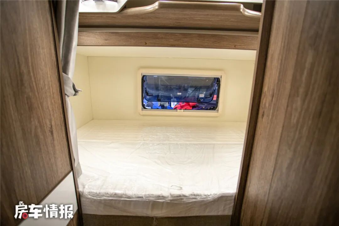 驾驶室上方依然是一张大尺寸的额头床,得益于车顶较高的隆起,额头床的内部空间表现很不错,睡下2名成年人完全没有问题,另外可以看到额头床两侧分别设有多个储物格,便于在休息时存放个人物品,如手表、首饰等,比较方便。