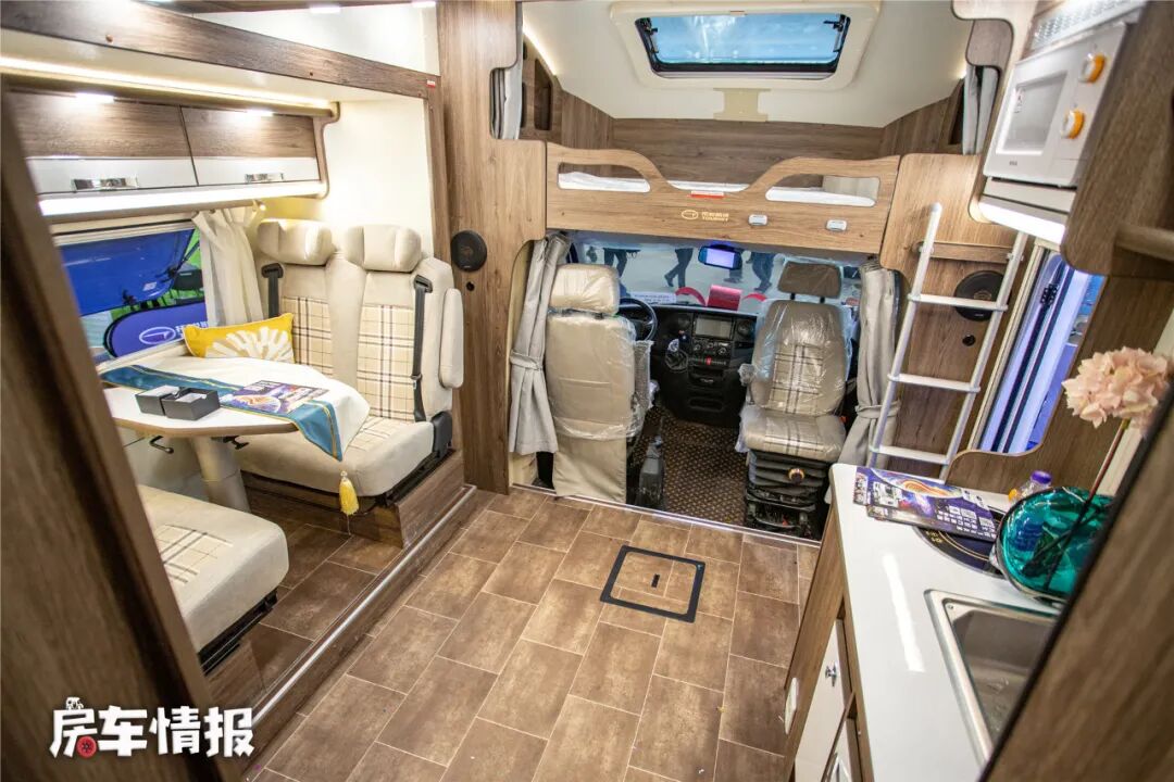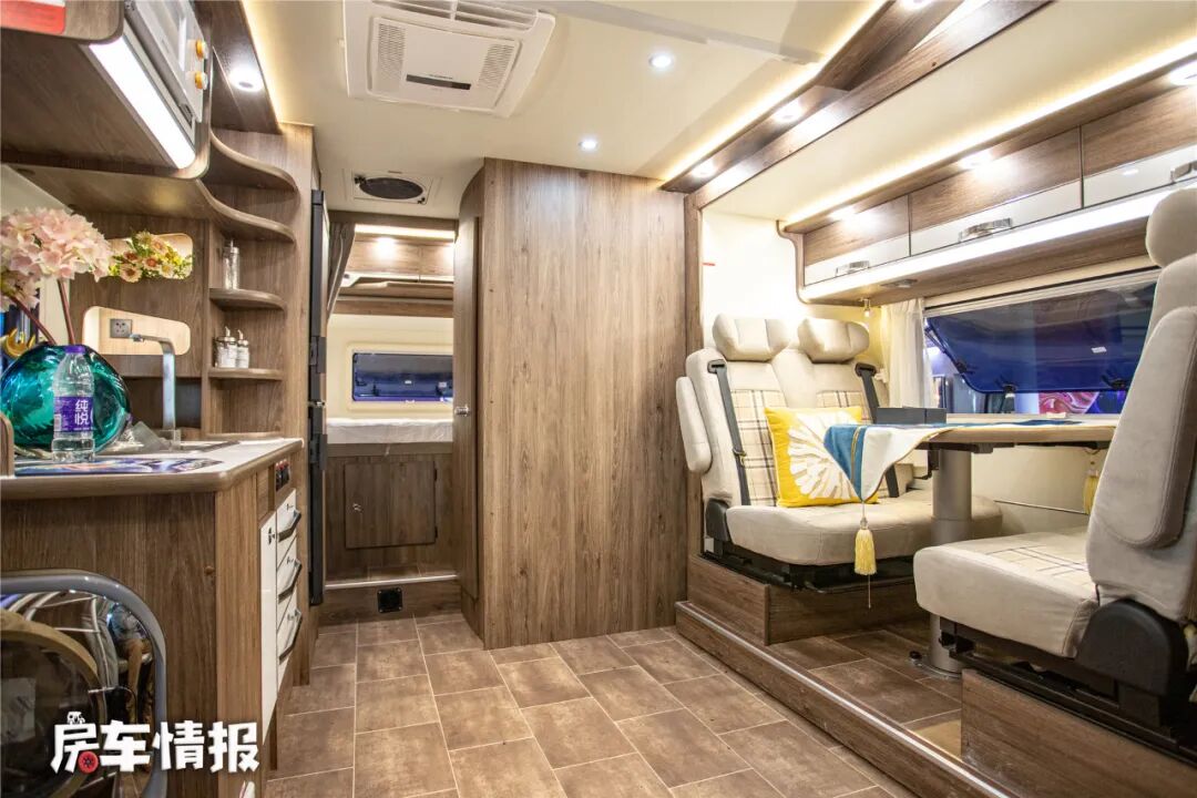 车身尺寸和主流车型保持相当,长宽高分别为5995*2488*3140mm,长度不足6米满足C本蓝牌驾驶,车身高度超过了3.1米,为车内额头床预留出了充足空间。