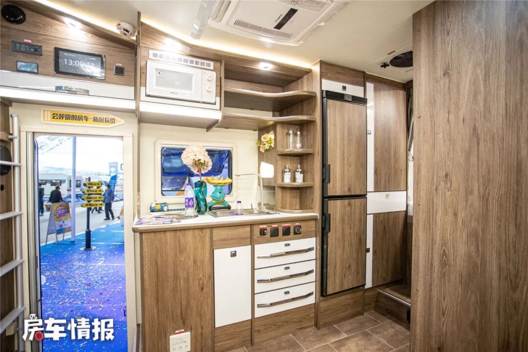 位于车厢中门后方是车内的厨房区域,尺寸相对其它品牌的双拓展车型来说,属于比较大的那类,提供了洗菜池、电磁炉、微波炉、冰箱等常用设备,在车内做些简单餐食还是没有问题的。