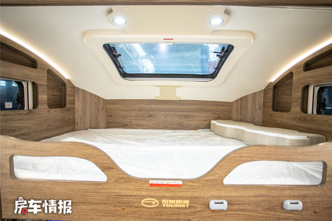 接下来看看车尾部的横置双人床,在尺寸上不用担心,睡下2名成年人完全没有问题,需要注意的是拓展舱打开后会形成长短不一的现象,日常使用时要避免磕碰;还有一点就是前面提到过的,卫生间和橱柜所组成的遮挡,使得这里变成了一个具有一定私密性的区域,对于一些睡觉缺乏安全感的人来说,是个不错的设计。