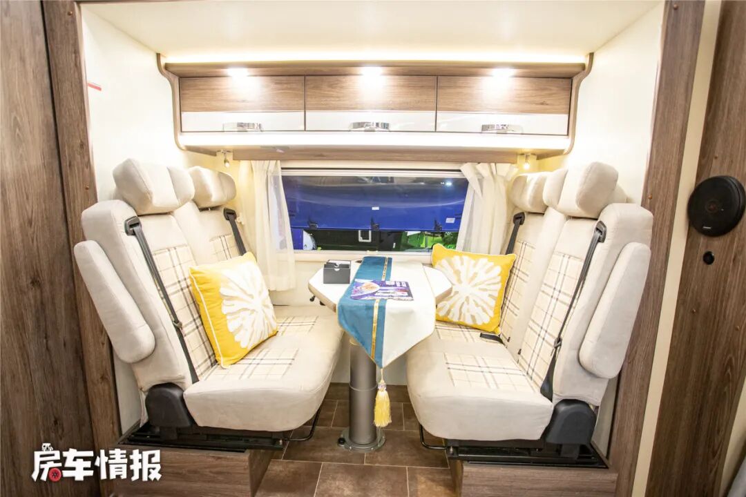 车身左侧拓展舱打开以后是四人对坐沙发所在的区域,整体尺寸表现不错,四个座椅的靠背还可以单独调节,日常乘坐的舒适性能够得到保证,另外在驻车以后还可以把餐桌降低,拼成一张儿童床。