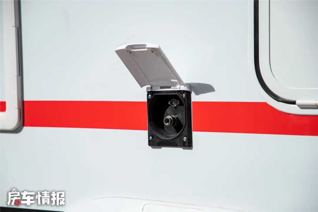车身后方还提供了一个自吸式加水口,可以很方便地把外部可移动的水桶内部的净水吸入车内净水箱,当不方便使用水管补水的时候,提供了更多的补给方式。