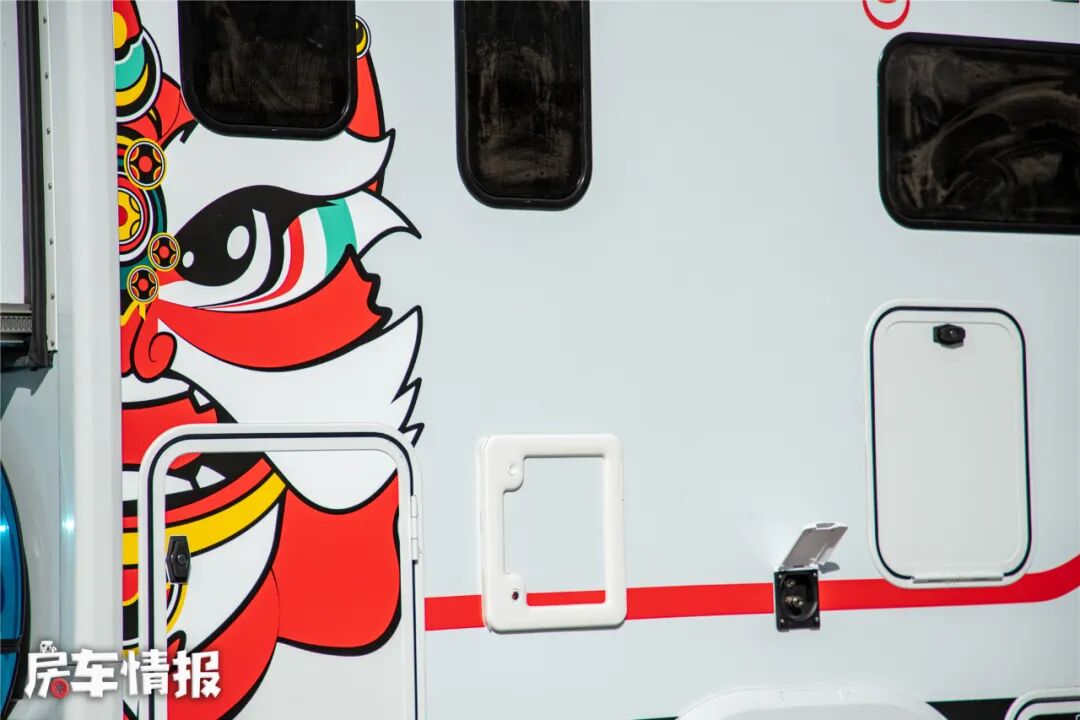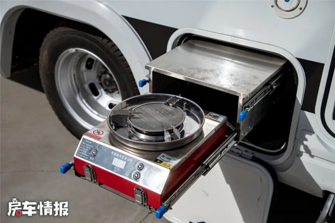 车身右侧为外部功能区域,顶部提供了一部手动遮阳棚,下方则提供了抽拉式柴油灶台和储物空间,柴油灶可以直接从100L的柴油箱里取油,为日常使用提供了便利性。