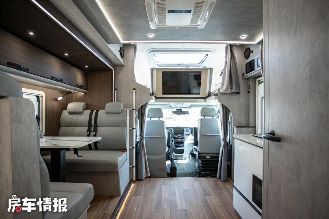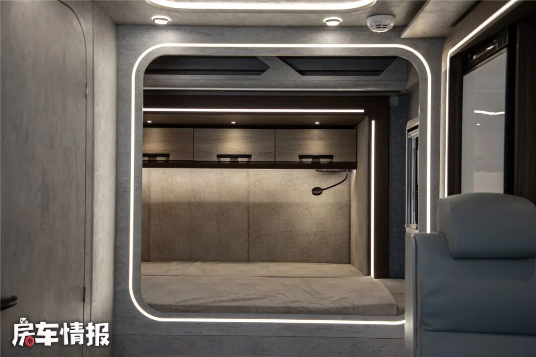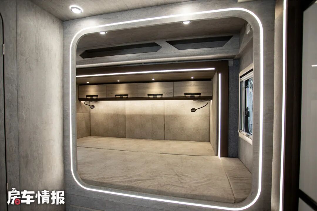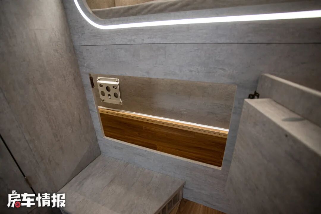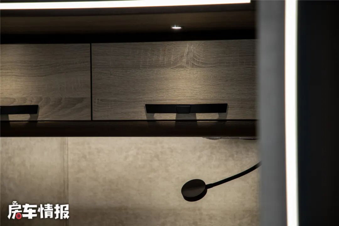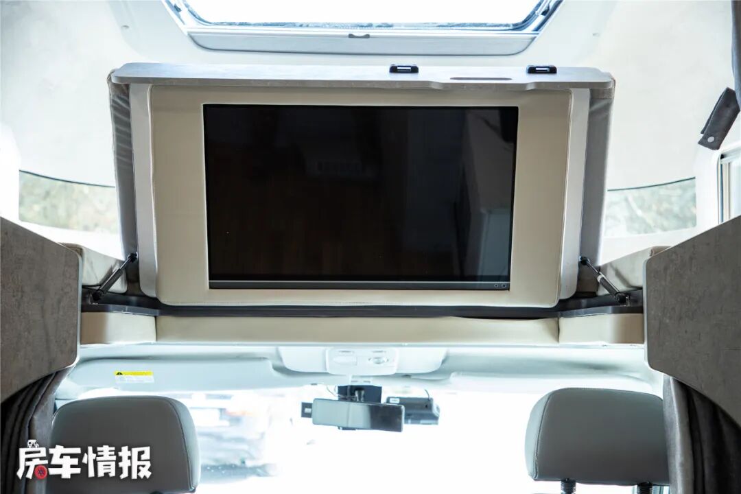 床板下方依然是一台翻折电视,不过我觉得在这样的一个生活区氛围里,如果提供一部投影幕布和投影仪就更完美了,搭配车内的JBL音箱可以获得不错的视听享受,哦对了,如果是音乐发烧友,后期还可选装哈曼卡顿音箱,这在房车里真的是太奢啦!
