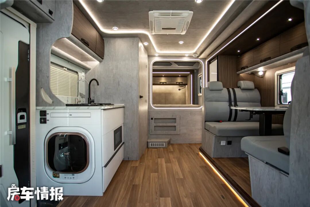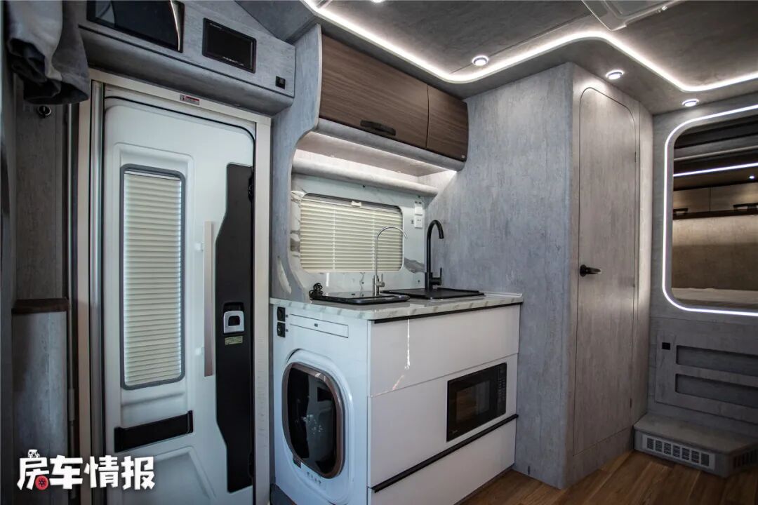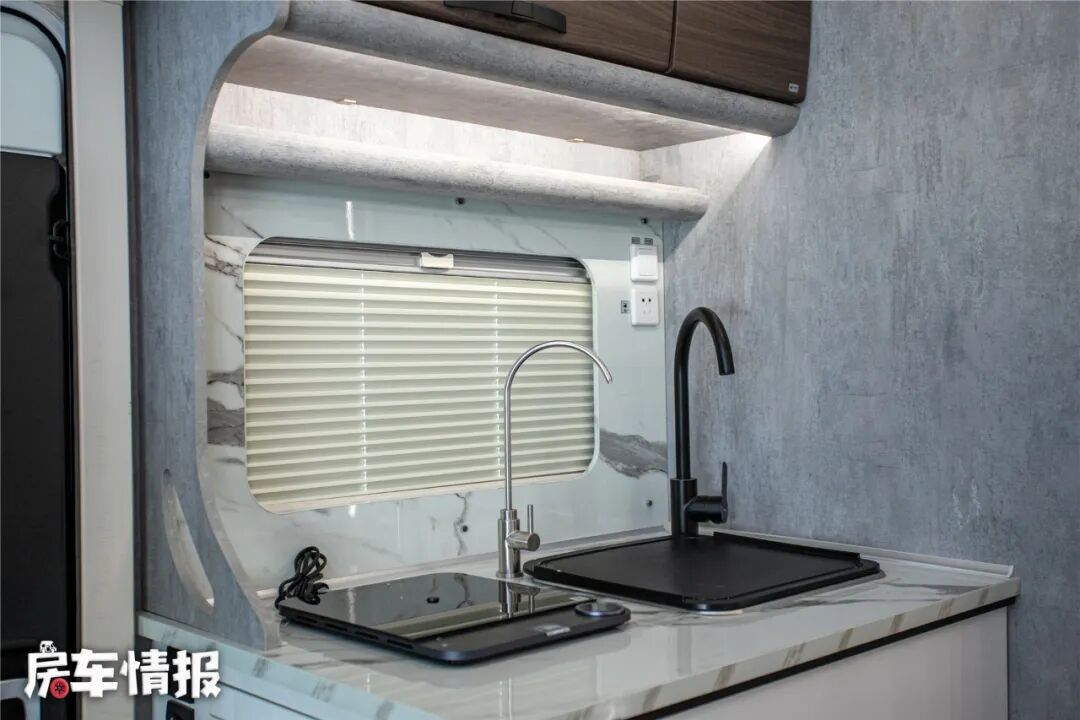 车厢右侧是车内的厨卫区域,车内厨房的整体设计比较耐看,功能性设备上比较常规,仅提供了一个尺寸挺大的洗菜池盆、直饮水水龙头以及微波炉,另外还提供了一台可移动的电磁炉,可以根据自己的使用需求来决定位置,车内多处都提供了220V插座。