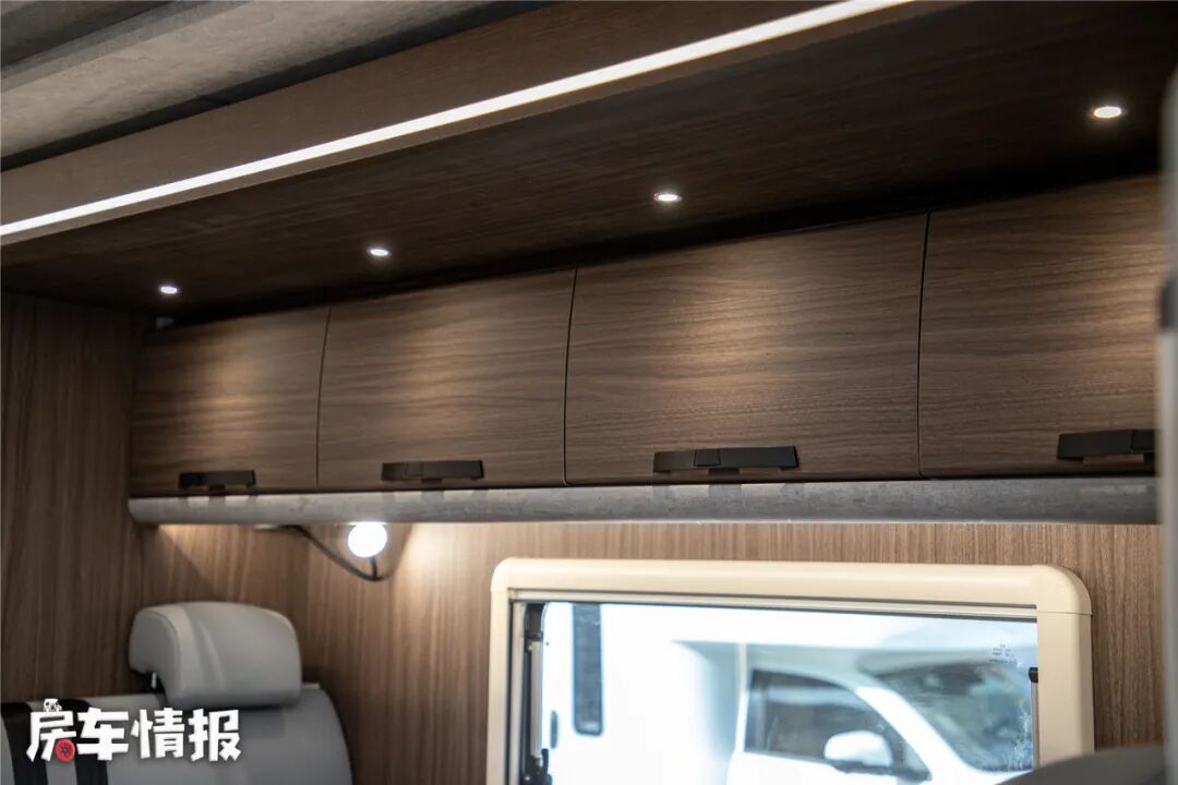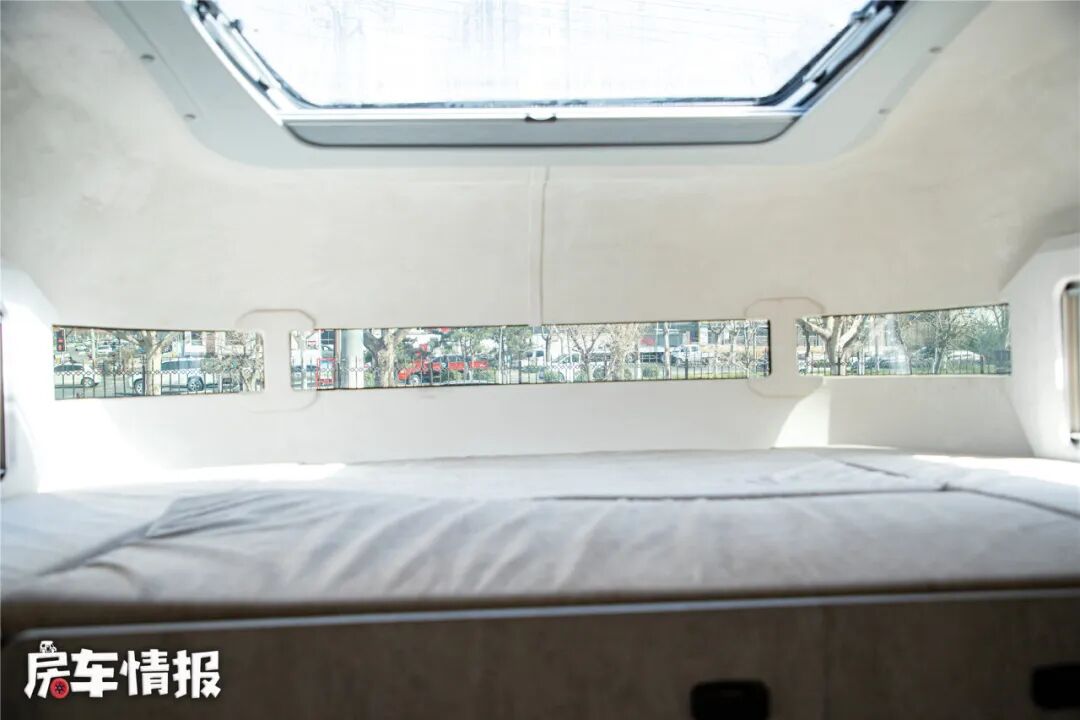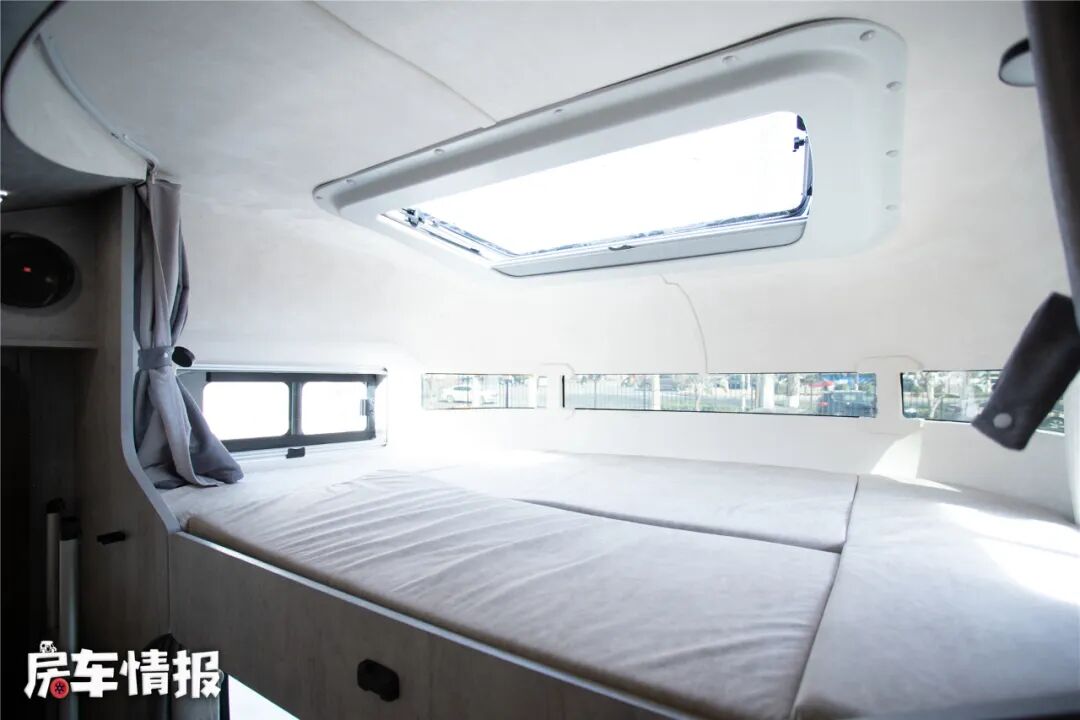 驾驶室顶部依然是一张大尺寸额头床,长宽达到了2140*1550mm,非常宽大,再加上大顶的设计,让这里的垂直空间表现非常不错,无论睡在内侧还是外侧,都不会感到压抑。
