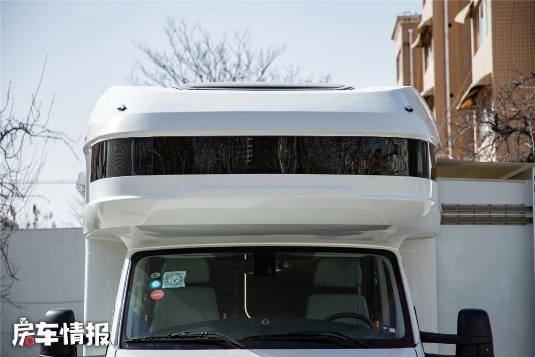 除了名字上的特殊意义之外,新车的外观设计上也和常规产品有着不一样的创新,尽管都是采用的南京依维柯欧胜底盘,但看到这款新车的第一眼,还是给我留下了深刻印象,尤其是驾驶室顶部饱满的额头造型设计,白加黑的撞色设计,看起来像极了科幻电影里未来战士的头盔,黑色的弧形夹胶玻璃就像墨镜,十分酷炫,不仅颜值高,这个设计内部也暗藏玄机,下文再为大家揭晓。