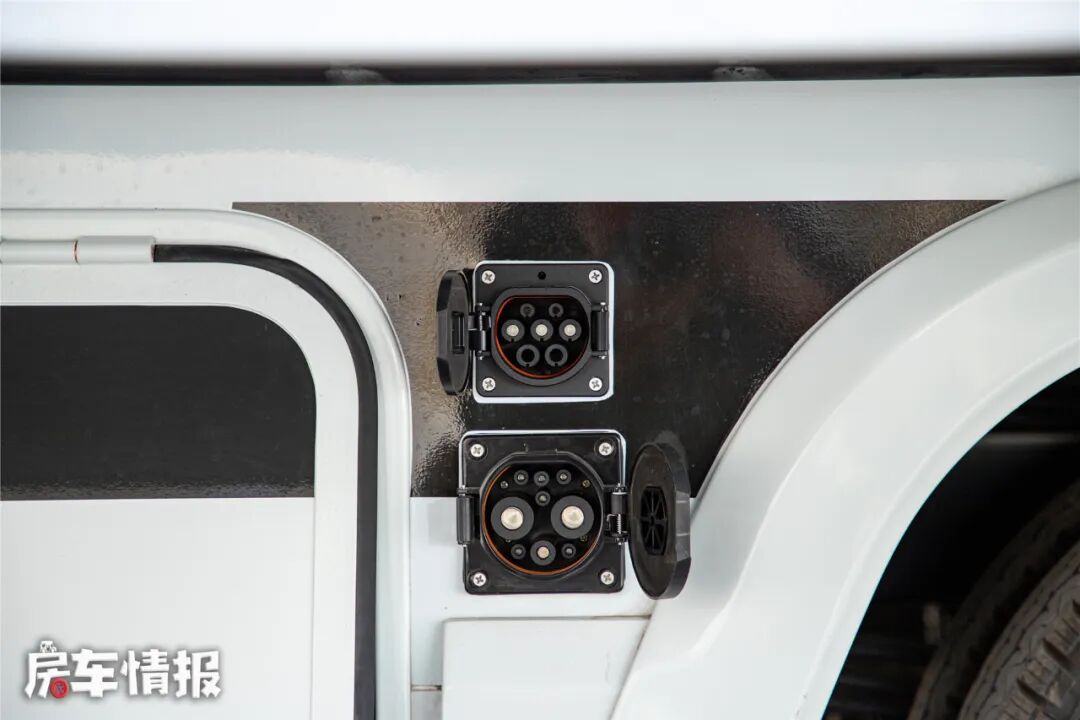 位于车厢左侧还带有两个新能源充电口,一个是标准220V接口,另一个则是汽车充电桩的高压充电口,这样的话在各种充电桩上都能充电。