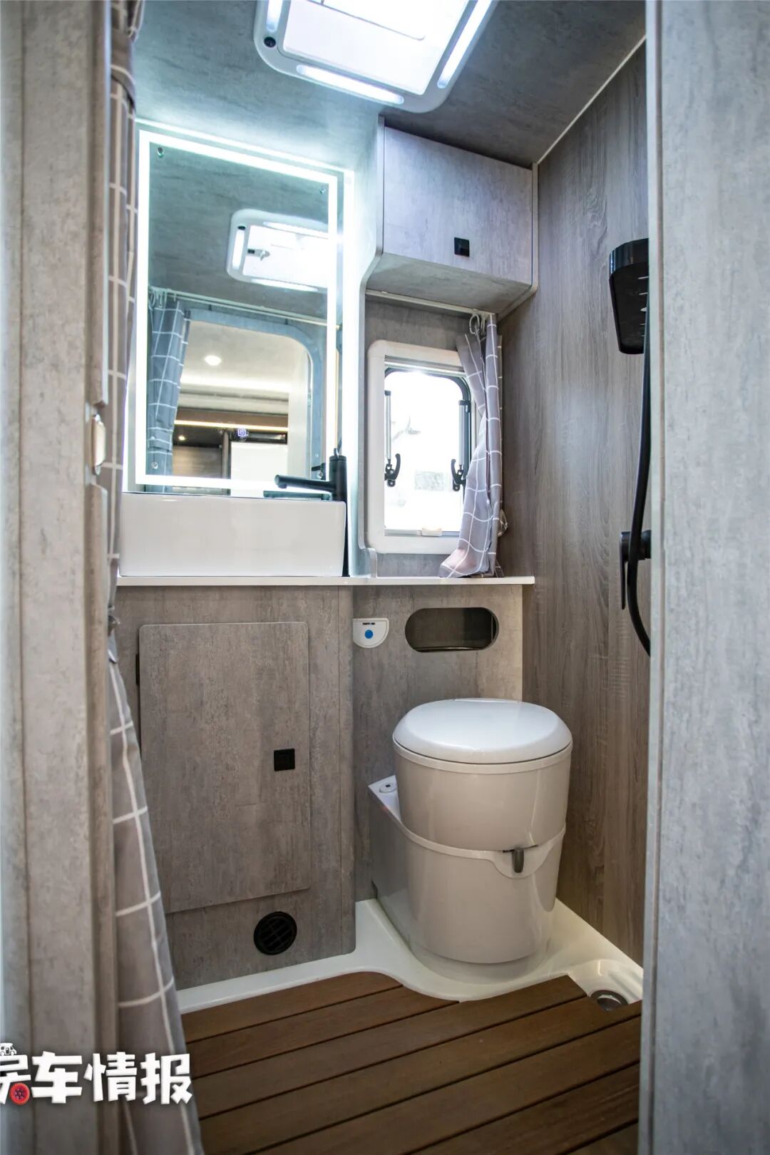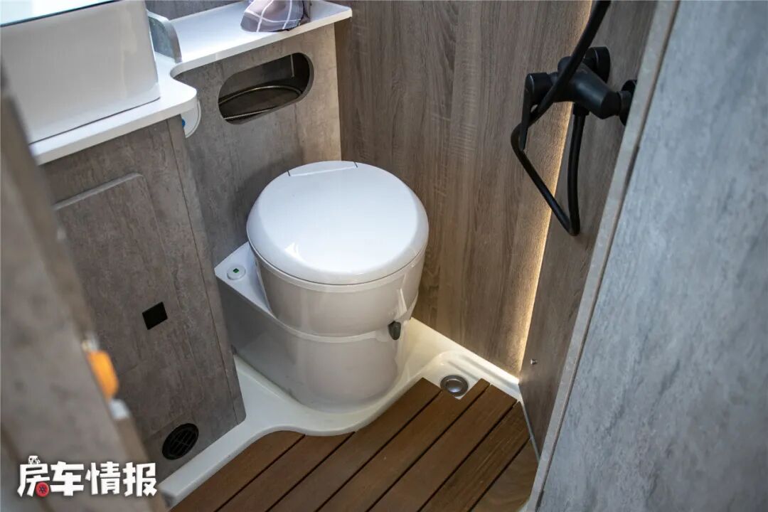 卫生间内部空间挺大,全新开模吸塑式设计,可以有效地防漏水防霉,内部提供了换气扇、独立淋浴花洒、梳妆镜、洗手盆等,搭配200L超大净水箱和70L灰水箱以及9kW燃油加热器,可以在车内洗个舒服的热水澡。