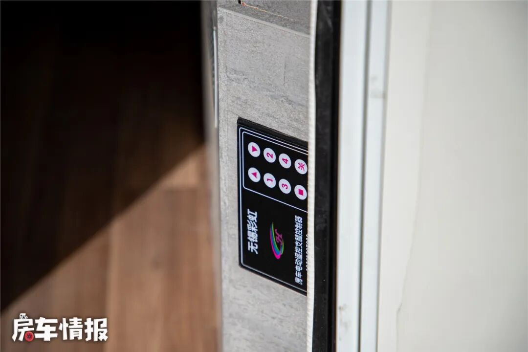 在车身底部还加入了电动平衡驻车支腿,可以在驻车以后,对车身进行调平和提升稳定性,这样的话即便在车内剧烈活动,车身也不会晃动,电动支腿的控制开关就位于贯通式储物舱内,带有中文提示,操作简单。