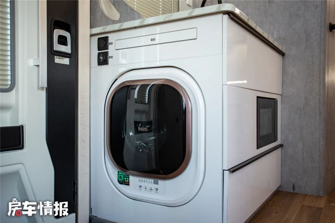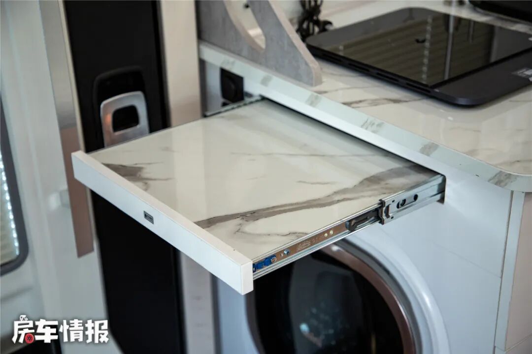 厨房外侧还提供了一台2.5kg洗衣机,便于在长途旅行中清洗自己的衣物。位于橱柜的外侧还是一个按压式的拓展板,打开以后能够拓展操作台尺寸。