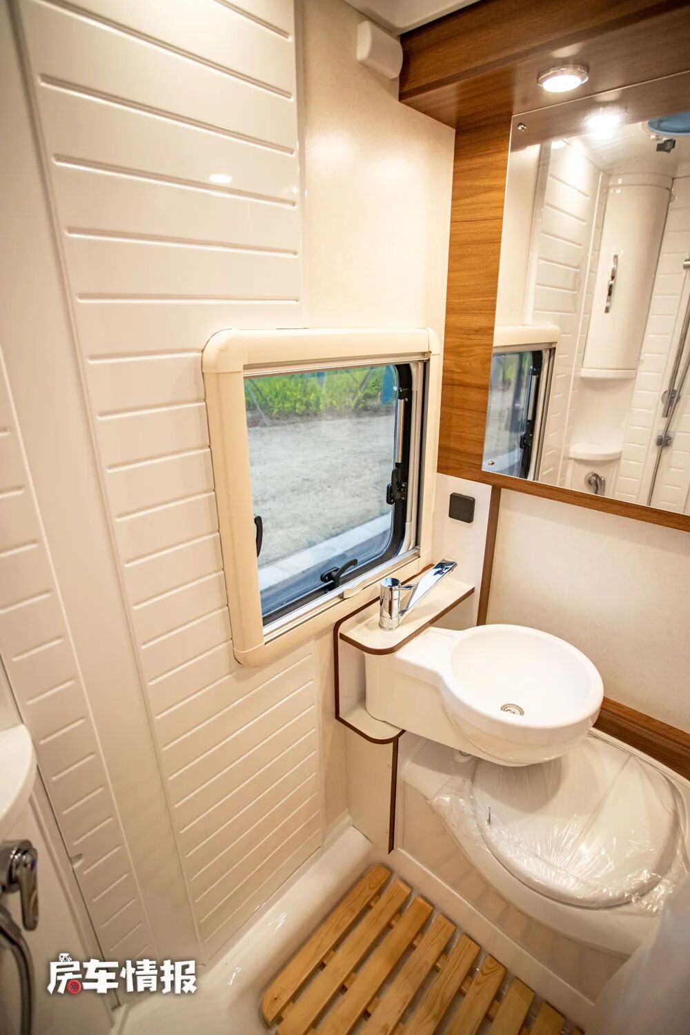 最后是位于车厢尾部的独立卫浴室,内部使用了大量的一体吸塑件,这样的好处不仅防潮防水,而且全部采用无胶的安装工艺,更加的环保和耐用,因为内部提供的是固定式的马桶和可旋转的洗手台盆,所以为淋浴预留出了更多的空间,而整体卫浴室的空间表现也是在同级别车型中数一数二的。