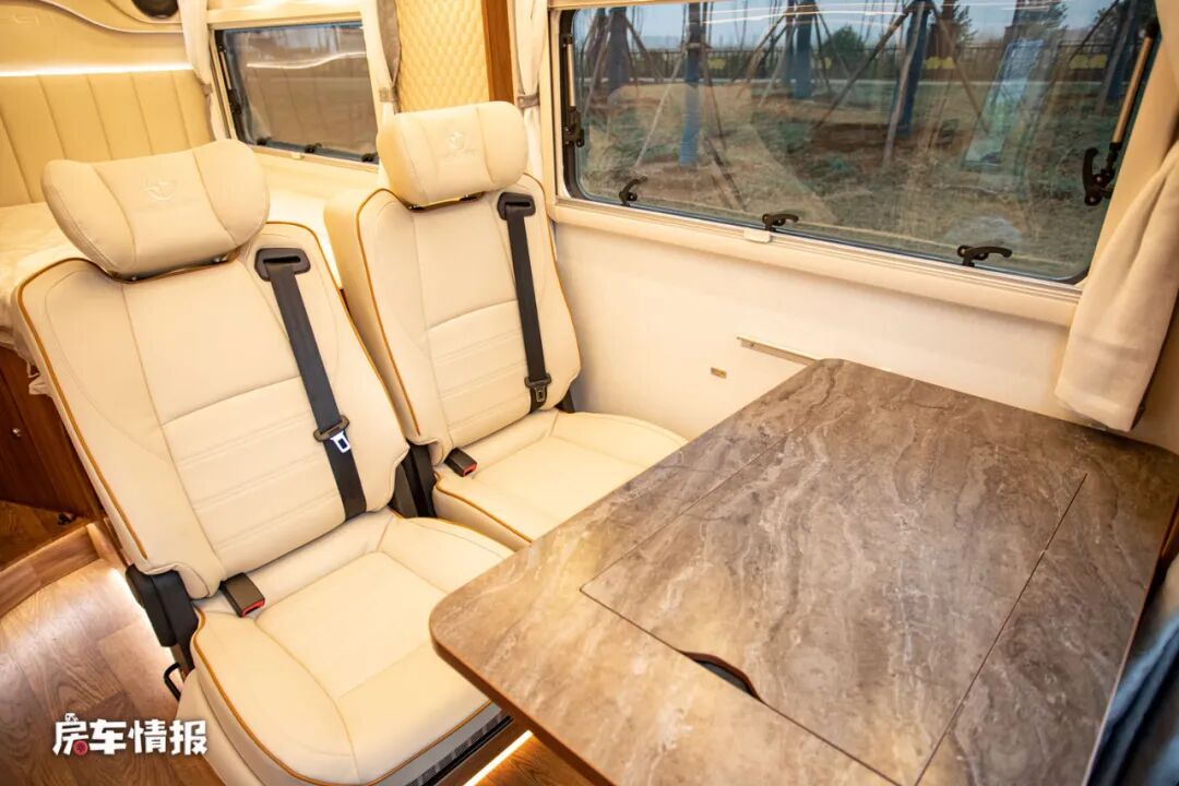 主驾驶座椅后方的会客区采用了双排座椅+升降餐桌的设计,使用乘用车级别的座椅可以为日后的乘坐带来更舒适的体验,而看起平平无奇的餐桌,其实在桌面底下还隐藏着一个茶水台,这也是朗宸独有的设计,无论是上了年纪的夫妻,还是年轻的小情侣,越来越多的人都更注重养生,所以这个吧台的设计还是很实用的。