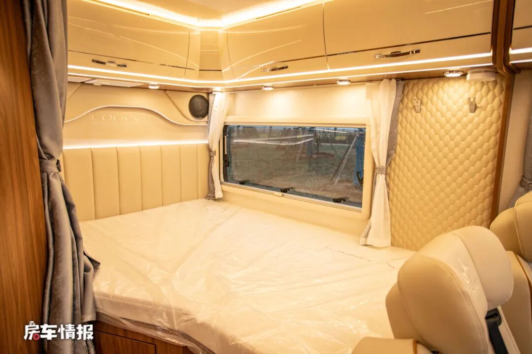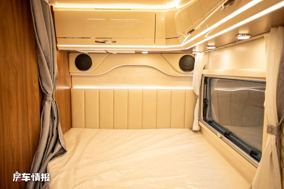 全车的休息区采用了纵置双人床的设计,因为样车没有加入拓展板,但是后期量产车会加入可拓展的部分,这样整张床的尺寸就可以达到1900*1350mm,也能够容纳两个成年人使用。