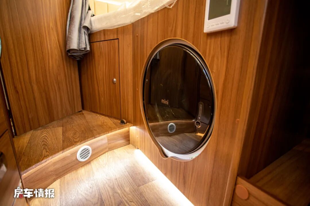 位于床板下方还嵌入了一台小型的洗衣机,方便日后清洗一些简单轻薄的衣物。