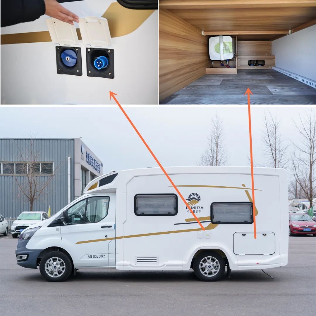 主驾驶一侧,标配了房车专用外接重力注水口、房车专用外接电源充电口并配有10米电源线,超大的尾部储物舱。