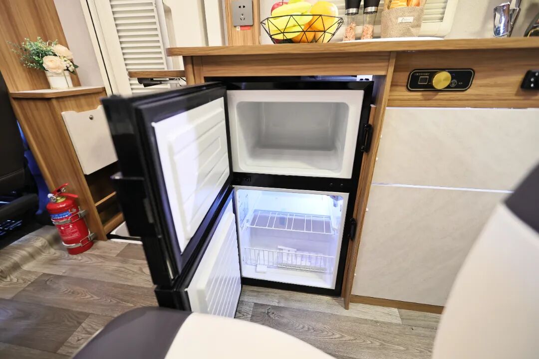 同时,厨台下方安装了85L双开门车载冰箱,并橱柜的上方及下方均预留了空间与厨卫收纳,让烹饪更从容自得。冰箱的位置设计对于坐在会客区的人来说,取送也十分自如。