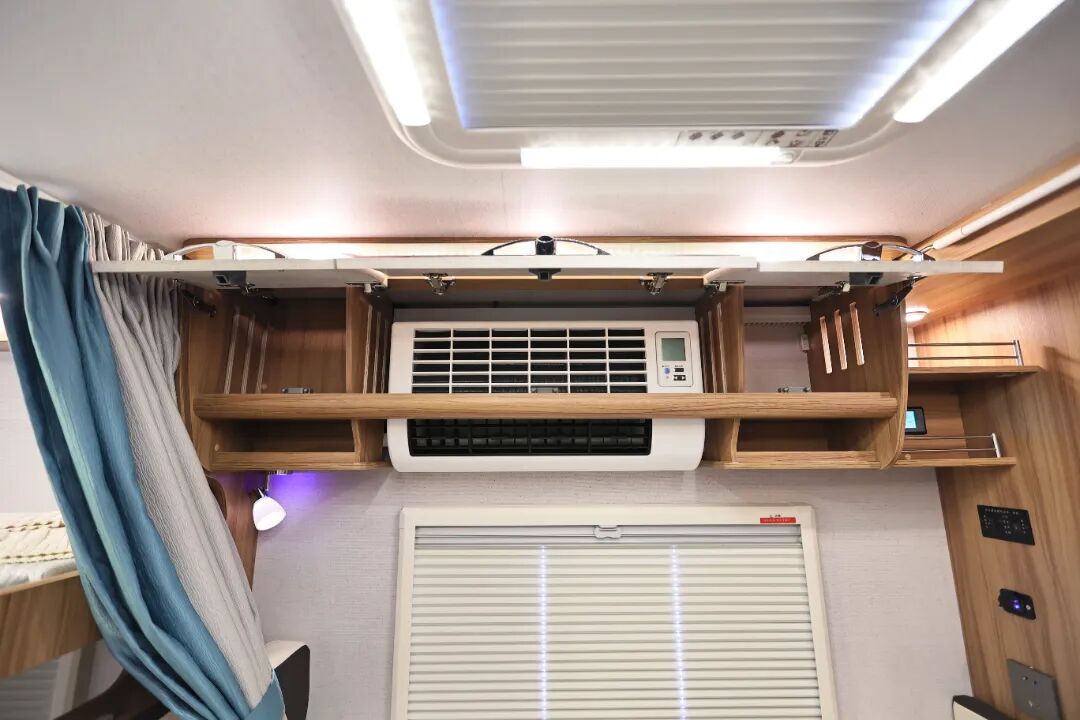 沙发上方,安装了KME 12V房车专用变频空调,这款空调体积小,与一般220V的家用空调相比,不需要开逆变器或者外接电,锂电池可直接供电,在空调的使用更加省电且方便。同时不占用车顶空间,为加装太阳能电池板留出更多空间。