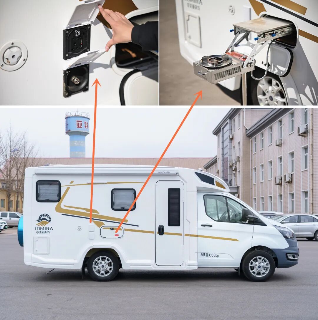 副驾驶一侧,标配了房车专用外部取水口并配有快接花洒、房车专用外部取电口和外置抽拉柴油灶。