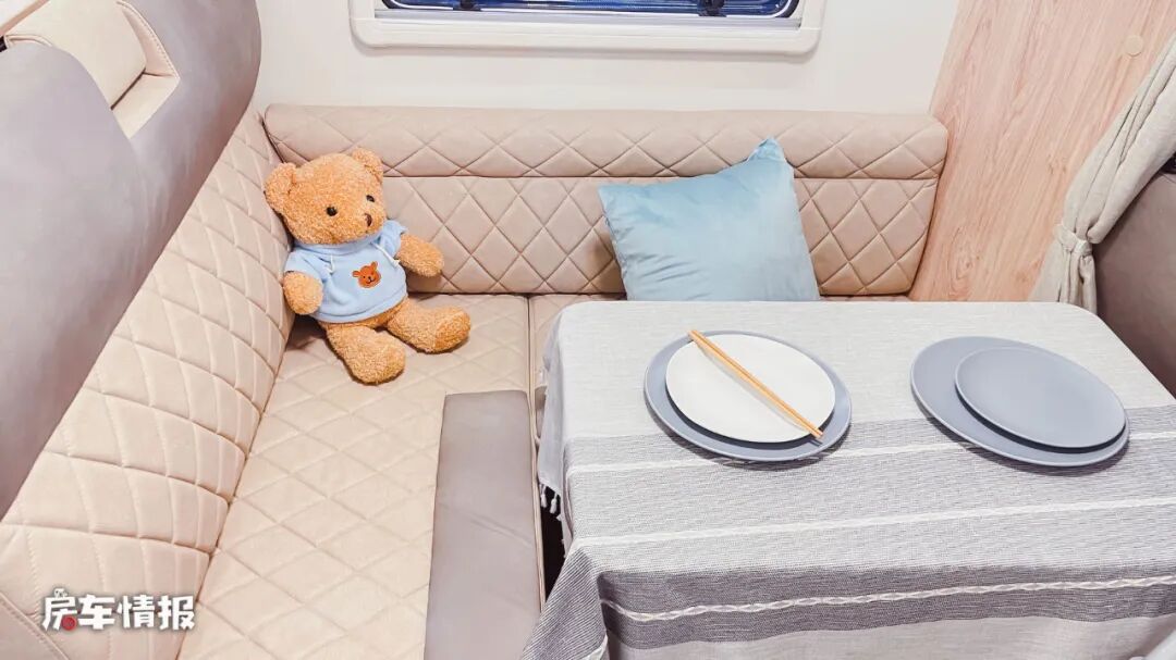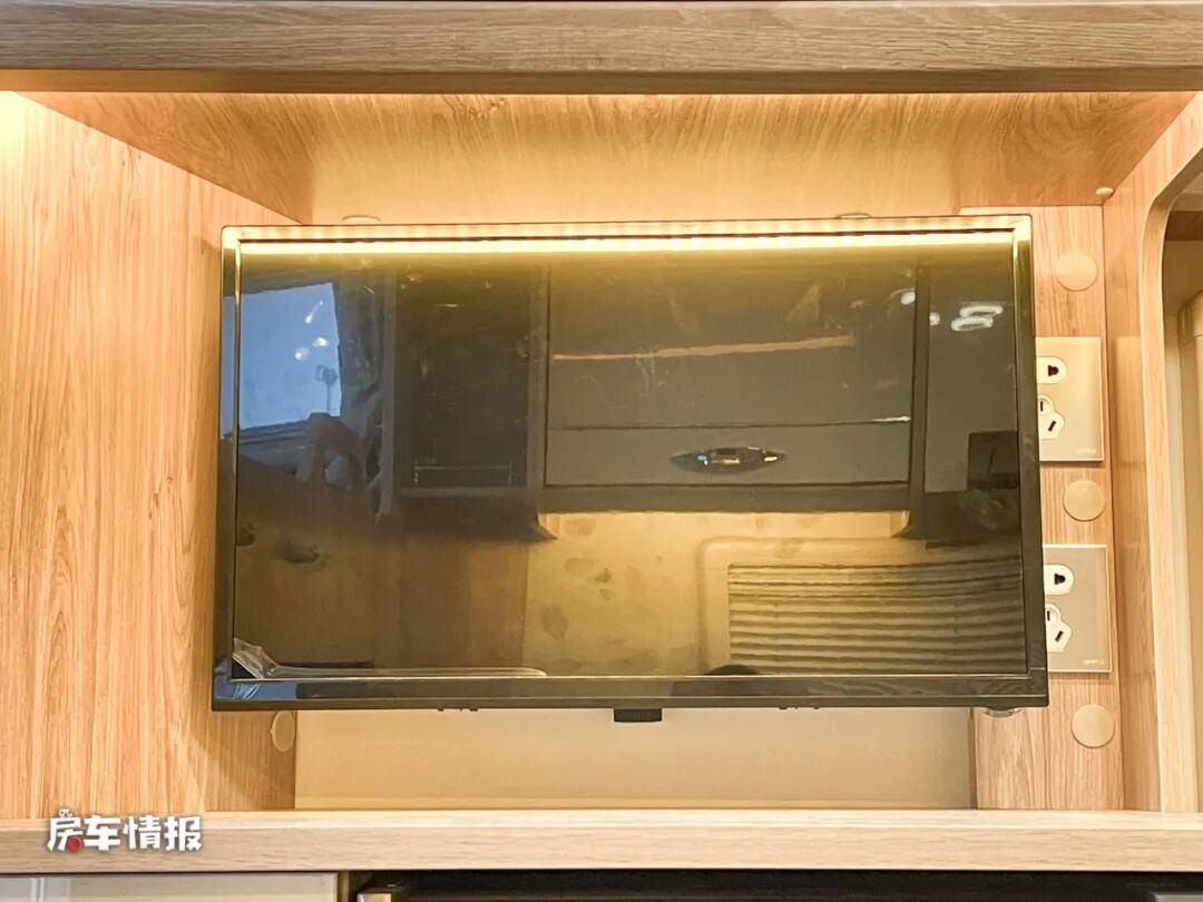 乘客门前方都是设计了一个小型的电视柜,配有24寸液晶电视,下方嵌入了一台80L的车载冰箱,这样在驻车的时候,两个人可以坐在会客区吃着零食喝着饮料看着电视节目,享受惬意的旅居生活。