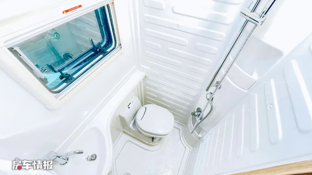 最后方都是配置了独立的卫浴室,在空间表现上也是不错的,完全能够满足日常的洗漱淋浴需求,带有可旋转的盒式马桶、洗手台盆和独立的淋浴花洒等洗漱设施。