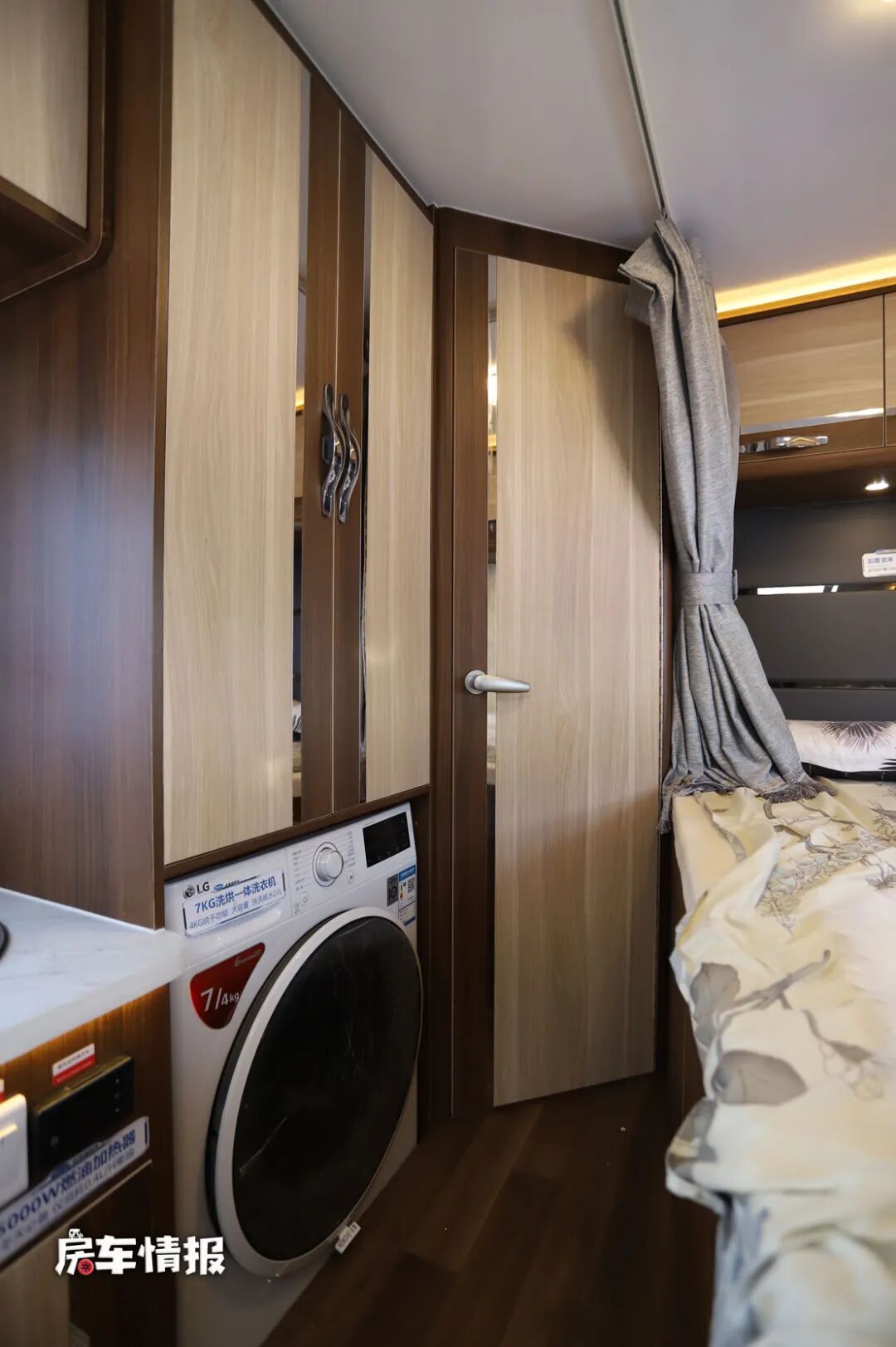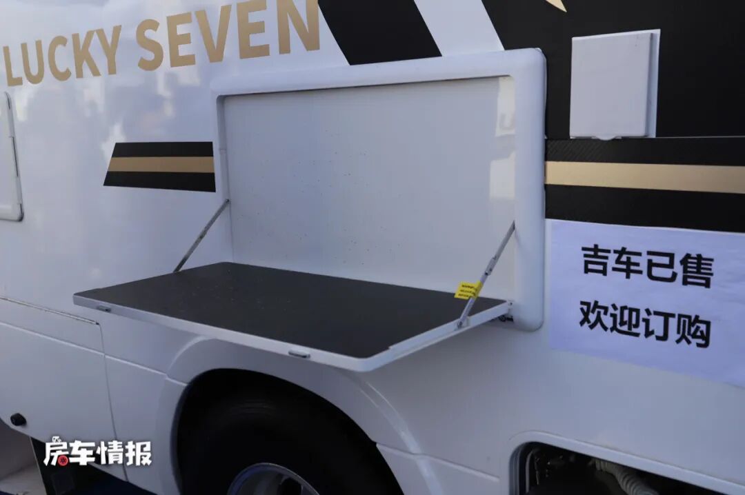 乘客门处配备了门联动踏步,方便上下车,此外,全车还提供了外接充电口、外置水枪、房车专用注水口、备胎罩和拖车钩等设施。