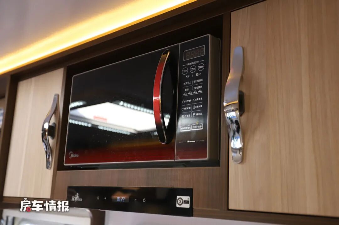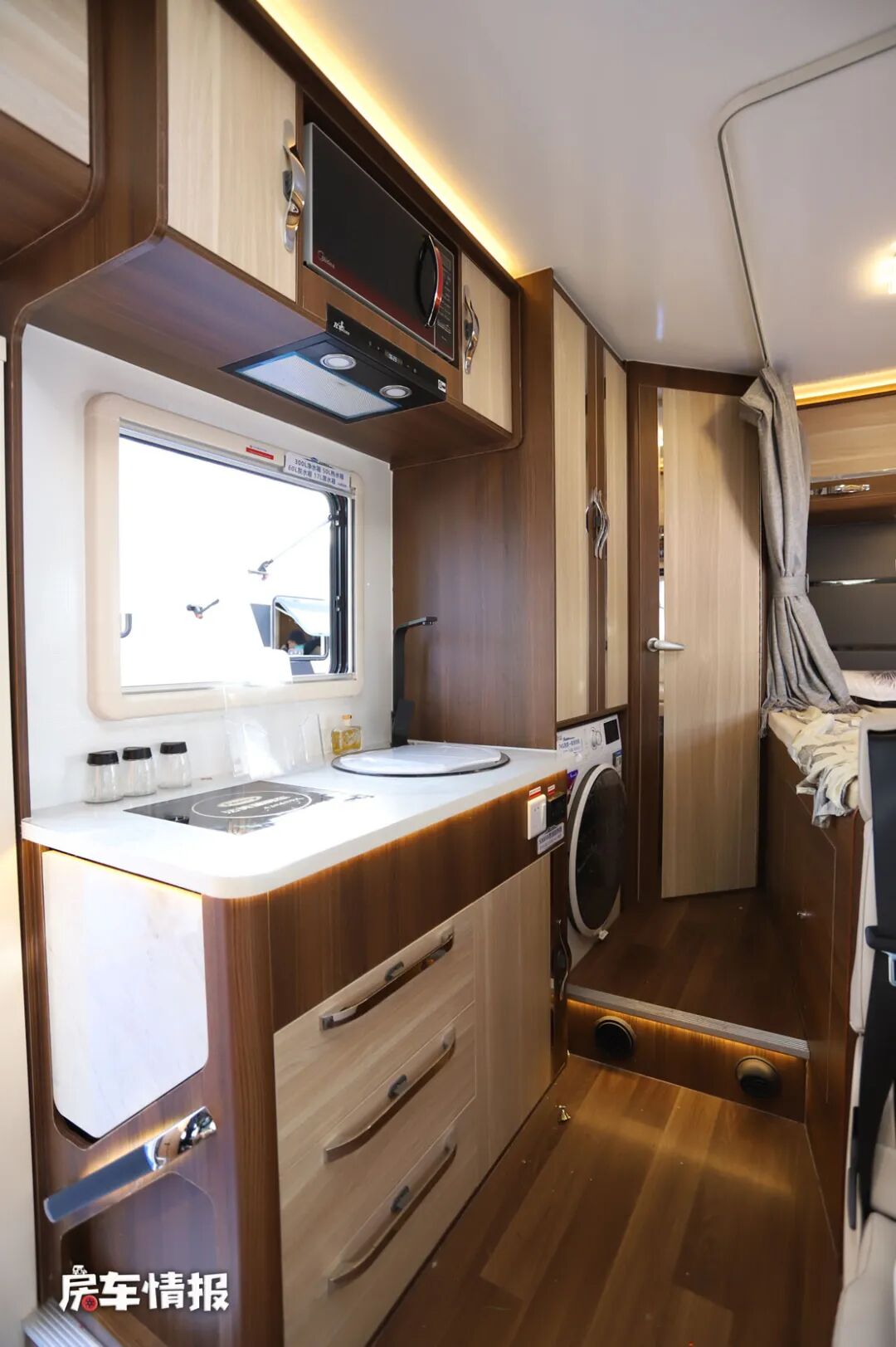 车客们的左侧为厨房区,台面的尺寸还算可以,电磁炉和水槽相比之下不那么的拥挤,上方提供了抽油烟机、微波炉和储物吊柜,下方则提供了多个储物抽屉,储物空间还是非常充足的。