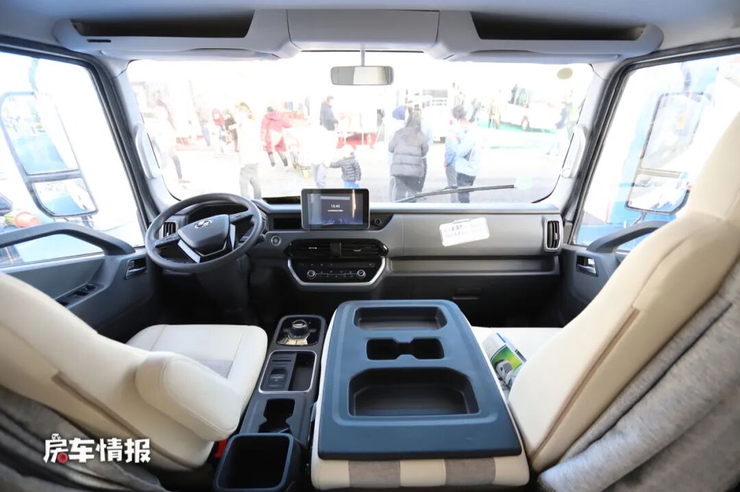 驾驶室的风格更偏向于商务风,黑色的中控台提供了一台彩色显示大屏和多功能方向盘,主副驾驶座椅采用了浅米色的皮拼布艺形式,舒适度也还不错,两个座椅之间还提供了大尺寸的置物栏,平时可以放水杯和手机等物品。