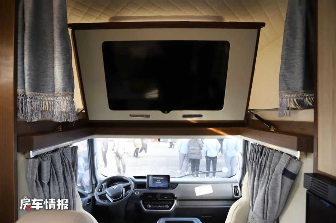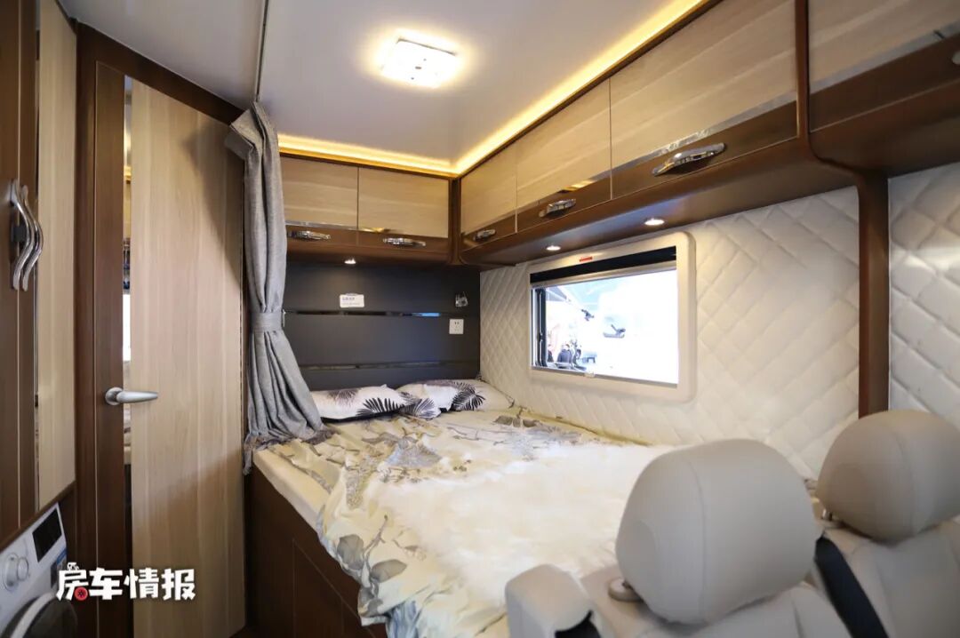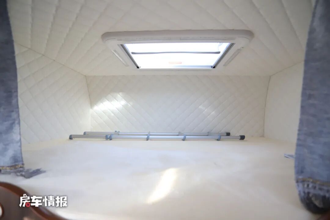 除去尾床和沙发床之外,在前部驾驶室上方的额头内,还提供了一张尺寸为2100*1400(mm)的双人床,也可以提供两个成年人休息使用。额头前部还配有天窗,增加采光量。