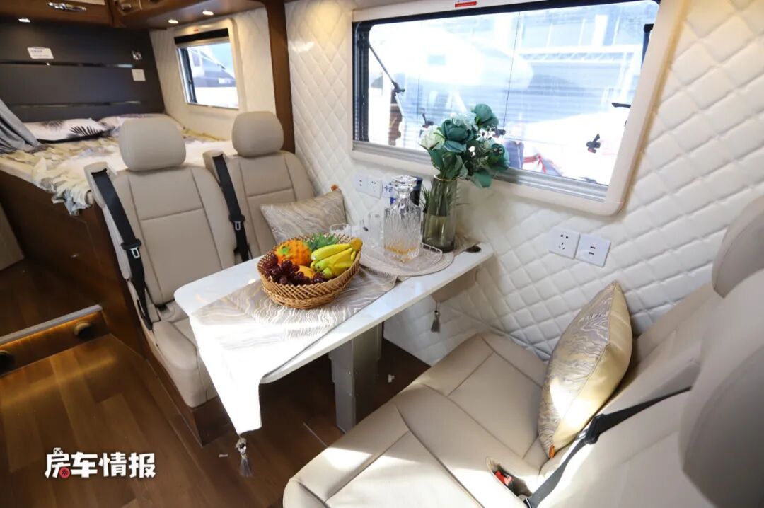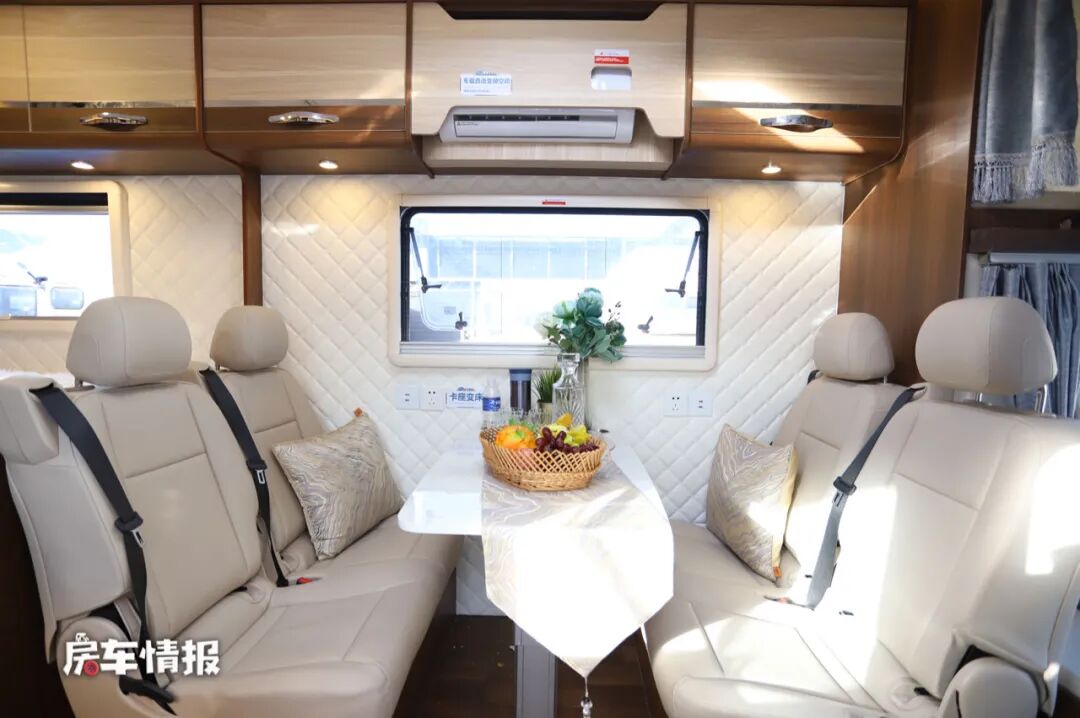 正对乘客门的会客区,提供了两排对坐皮质软包沙发座椅,并配备了头枕和安全带,平时行车时也可以坐人,中间的升降餐桌采用了大理石台面,并配备了杯槽。会客区上方提供了两个储物吊柜和一台变频空调,随时可以调节车内的温度。