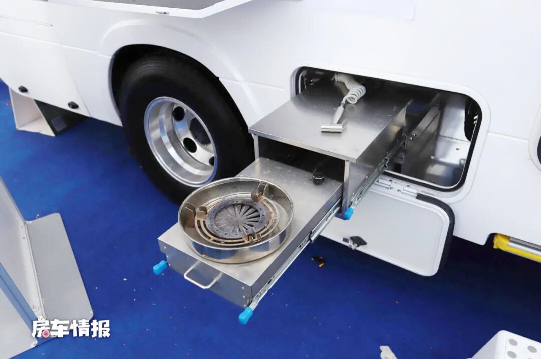 车身采用了三明治一体成型FRP车厢结构,右侧上方提供了一个4米的遮阳棚,下方配备了一个外置抽拉燃气灶和翻版,方便平时驻车时在车外做饭炒菜,而不必担心油烟的问题。