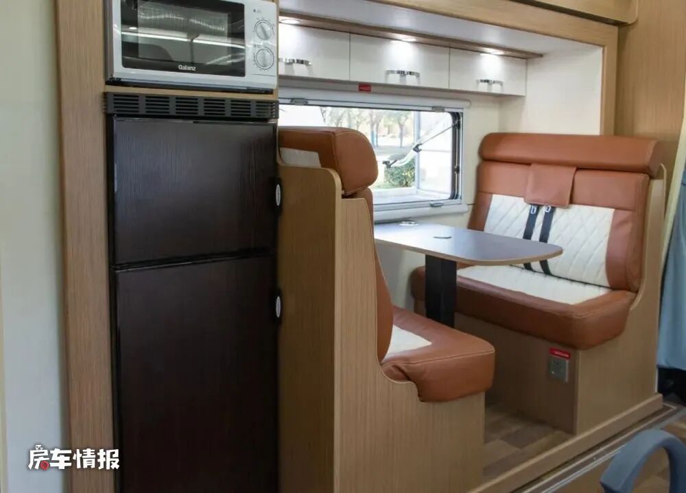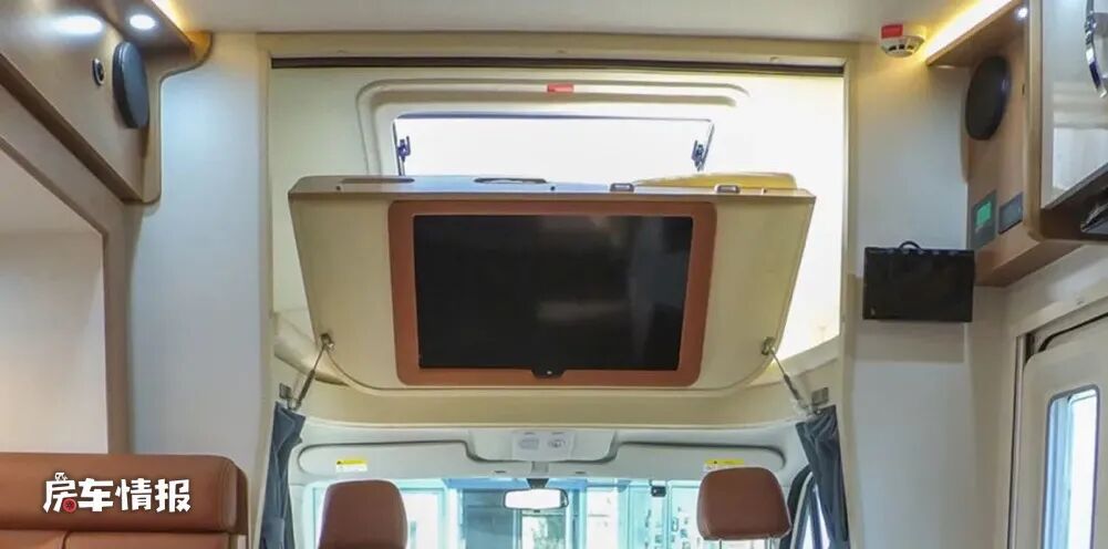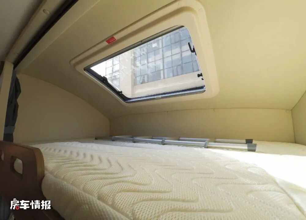 车内的设计和普通的家用房车有相似的地方,比如最前方驾驶室上方的额头区域,日常可以作为医生中午午休的地方,床铺的大小尺寸为2100*1350mm,带有天窗,整体感觉也比较通透。