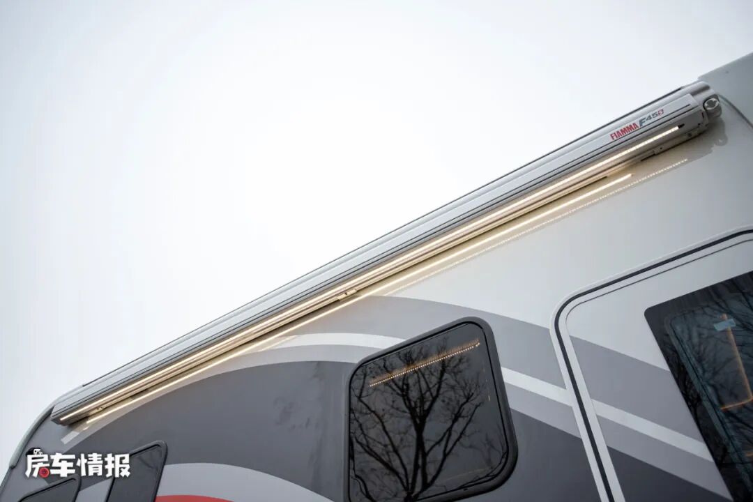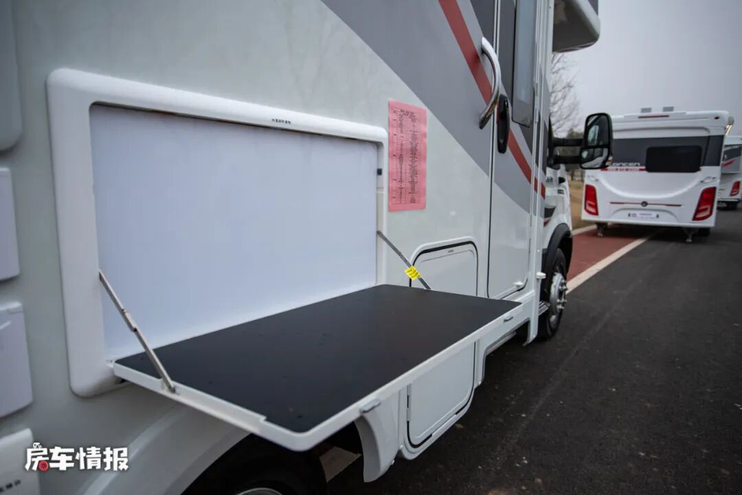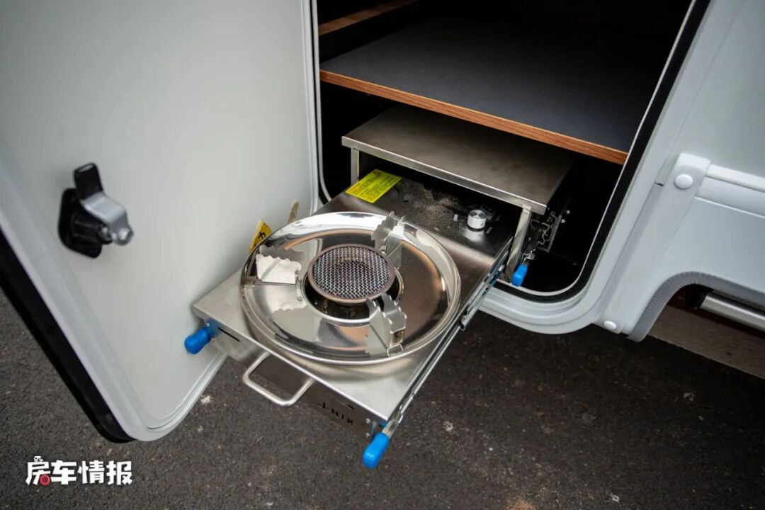 这款车在车身外部的配置还是挺丰富的,包括手动的遮阳棚、外置的抽拉燃油灶、外置小桌板、贯通式行李舱、水电接驳口等,也可以打造成一个户外的烹饪区。